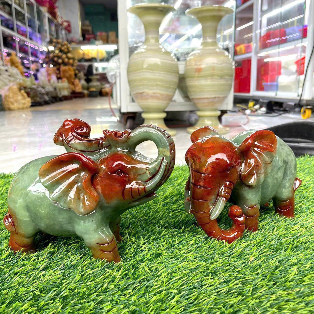 Điểm khiến cặp Voi Ngọc Huyết Đỏ trở nên đặc biệt chính là sắc đá tự nhiên chuyển từ đỏ sang xanh ngọc vô cùng hiếm gặp. Khu vực đầu, tai, chân và vòi voi ánh lên sắc đỏ huyết – sắc màu tượng trưng cho sự sống, nhiệt huyết và nguồn năng lượng mạnh mẽ. Trong khi đó, thân voi là sắc xanh ngọc thanh khiết, nhẹ nhàng, mang ý nghĩa về sự cân bằng và bình an. Hai màu hòa quyện với nhau không chỉ tạo nên vẻ đẹp sang trọng mà còn thể hiện sự giao thoa của âm – dương, của sức mạnh và sự điềm tĩnh, của vận khí tài lộc và sự ổn định. Mỗi đường vân, mỗi điểm chuyển màu đều mang nét tự nhiên và duy nhất, giúp sản phẩm vừa có tính thẩm mỹ vừa mang giá trị phong thủy thực sự.