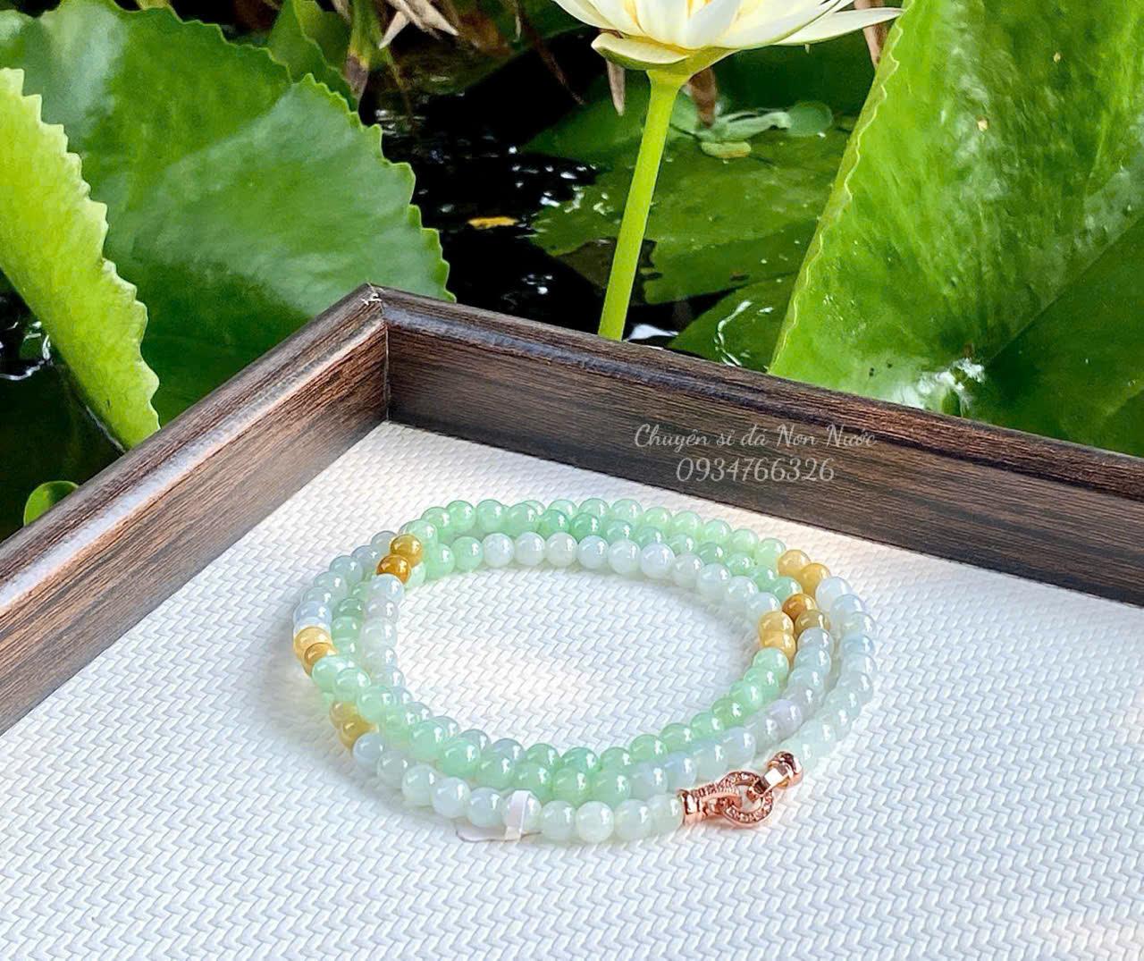 Chuỗi sử dụng ngọc Type A thiên nhiên, giữ nguyên cấu trúc đá mà không qua xử lý hóa chất. Nhờ đó, sản phẩm có độ bền cao và giá trị lâu dài. Bề mặt từng hạt được mài nhẵn, bóng nhẹ, sờ vào mịn và mát tay. Độ trong của ngọc đạt mức vừa phải, không quá trong suốt nhưng đủ để ánh sáng xuyên qua tạo cảm giác trong mướt tự nhiên. Khi đeo lâu, chuỗi có xu hướng lên nước, bề mặt ngày càng bóng hơn và màu sắc trở nên dịu, sâu hơn – một nét đẹp rất đặc trưng của dòng ngọc tự nhiên.