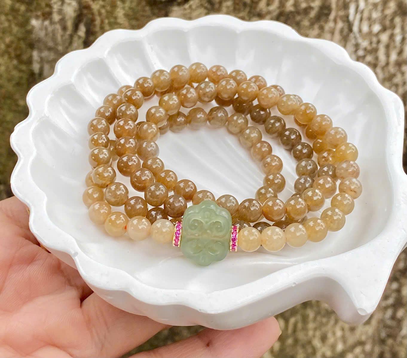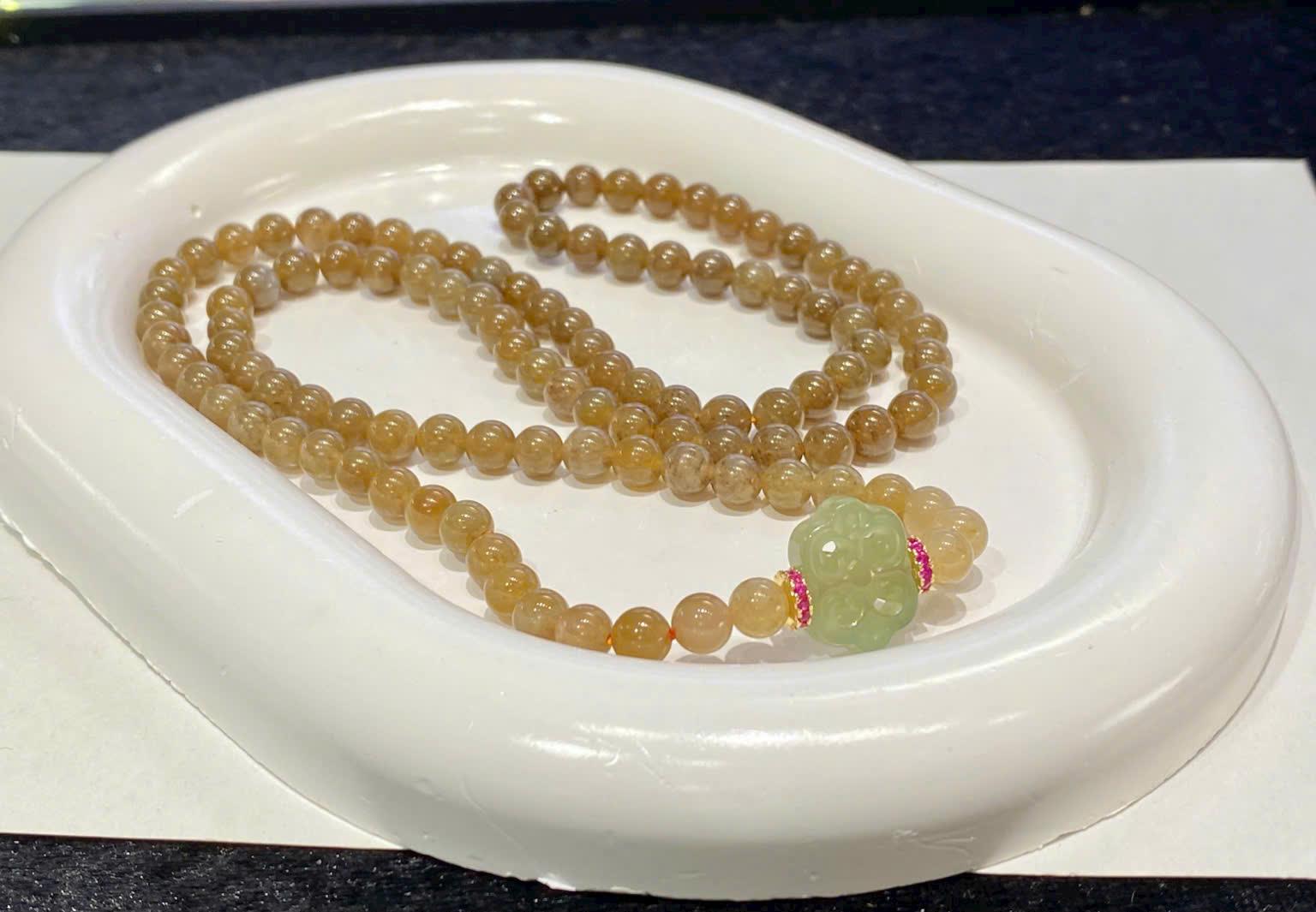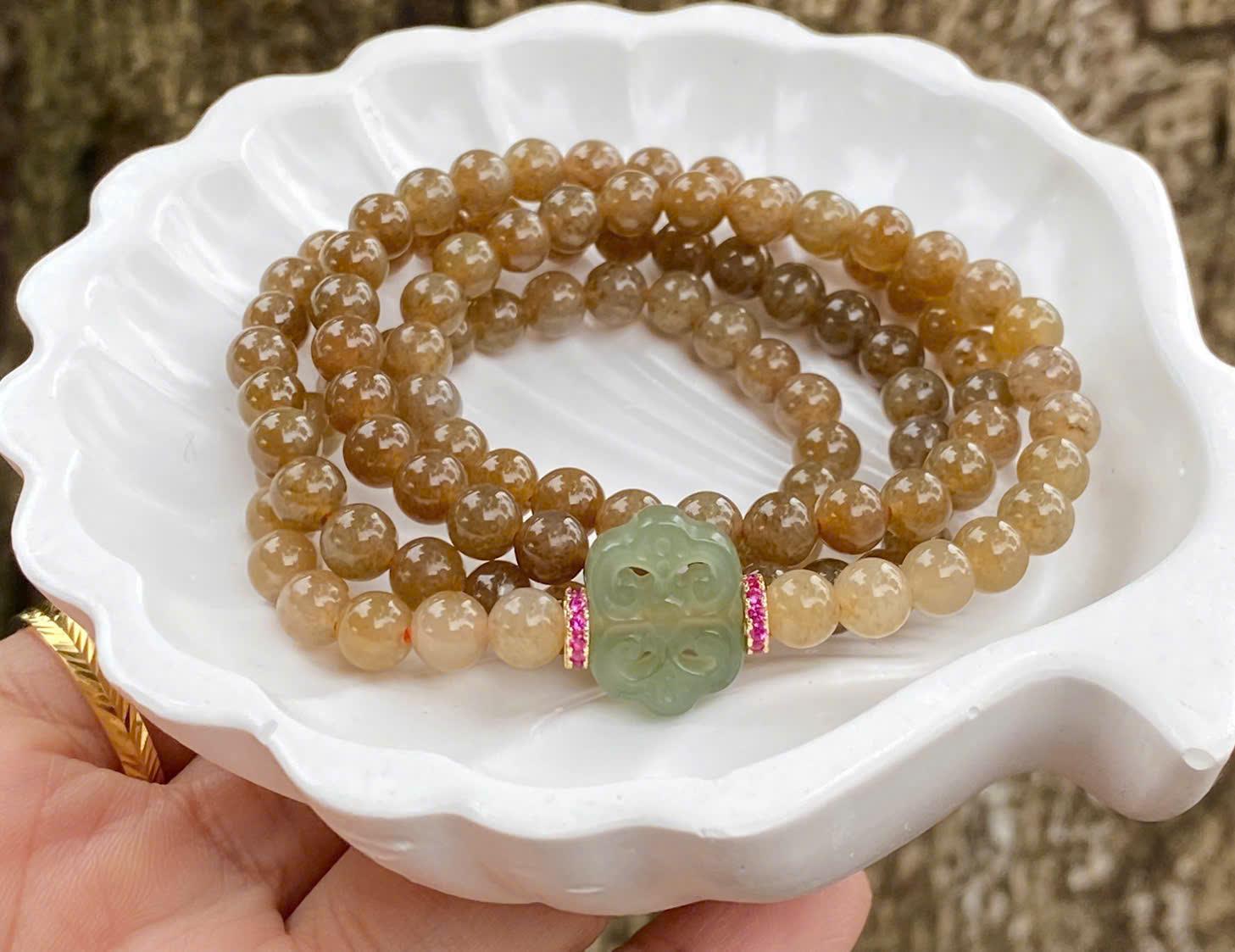 Chuỗi ngọc Hòa Điền 6li mix charm là mẫu trang sức mang vẻ đẹp nhẹ nhàng nhưng đầy chiều sâu, phù hợp với những ai yêu thích sự tinh tế, mộc mạc và giá trị bền vững theo thời gian. Ngay từ ánh nhìn đầu tiên, chuỗi ngọc gây ấn tượng bởi sắc ngọc vàng nâu ấm áp, trong trẻo vừa phải, kết hợp cùng charm chạm khắc xanh ngọc dịu mắt, tạo nên tổng thể hài hòa, trang nhã và rất “có hồn”.