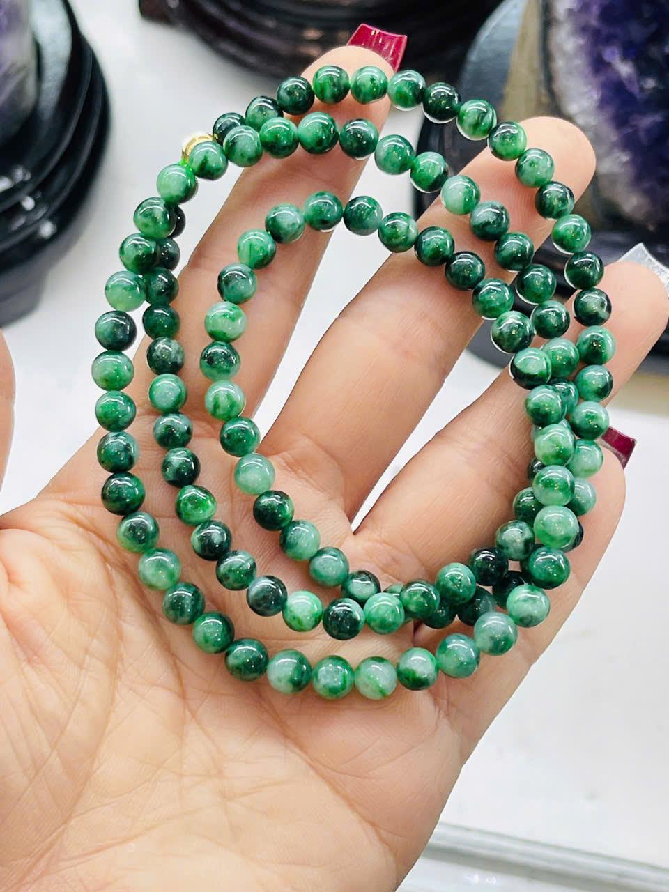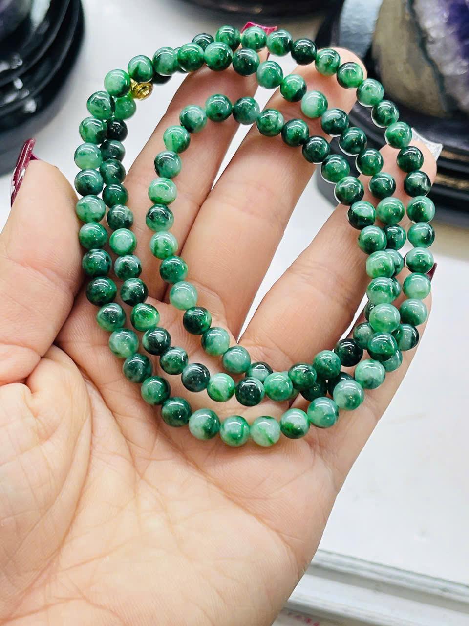 Sự pha trộn giữa các tông xanh từ sáng đến đậm giúp chuỗi vòng có chiều sâu thị giác, tạo hiệu ứng bắt sáng nhẹ nhàng. Khi quan sát kỹ, bạn sẽ thấy mỗi hạt đều có họa tiết riêng, không hạt nào giống hạt nào – đây chính là giá trị đặc trưng của đá tự nhiên.