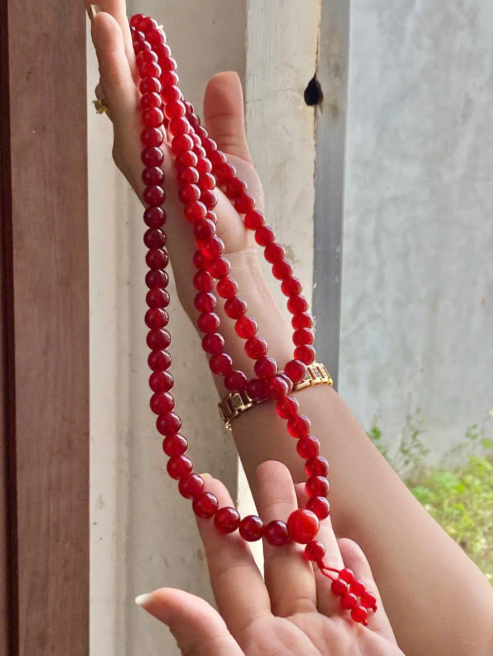 Mã não đỏ là dòng đá được hình thành từ tự nhiên qua hàng triệu năm, sở hữu cấu trúc bền chắc và màu sắc ổn định. Trên từng hạt 10li của chuỗi tràng, bạn có thể thấy rõ độ bóng mịn và độ trong vừa phải đặc trưng của mã não, mang lại cảm giác sang trọng khi quan sát gần và nổi bật khi nhìn từ xa. 108 hạt được xâu thủ công tỉ mỉ, từng khoảng cách hạt được cân chỉnh đều đặn, tạo nên tổng thể hài hòa và thoải mái khi đeo trên tay hoặc quấn nhiều vòng để sử dụng như vòng cổ.