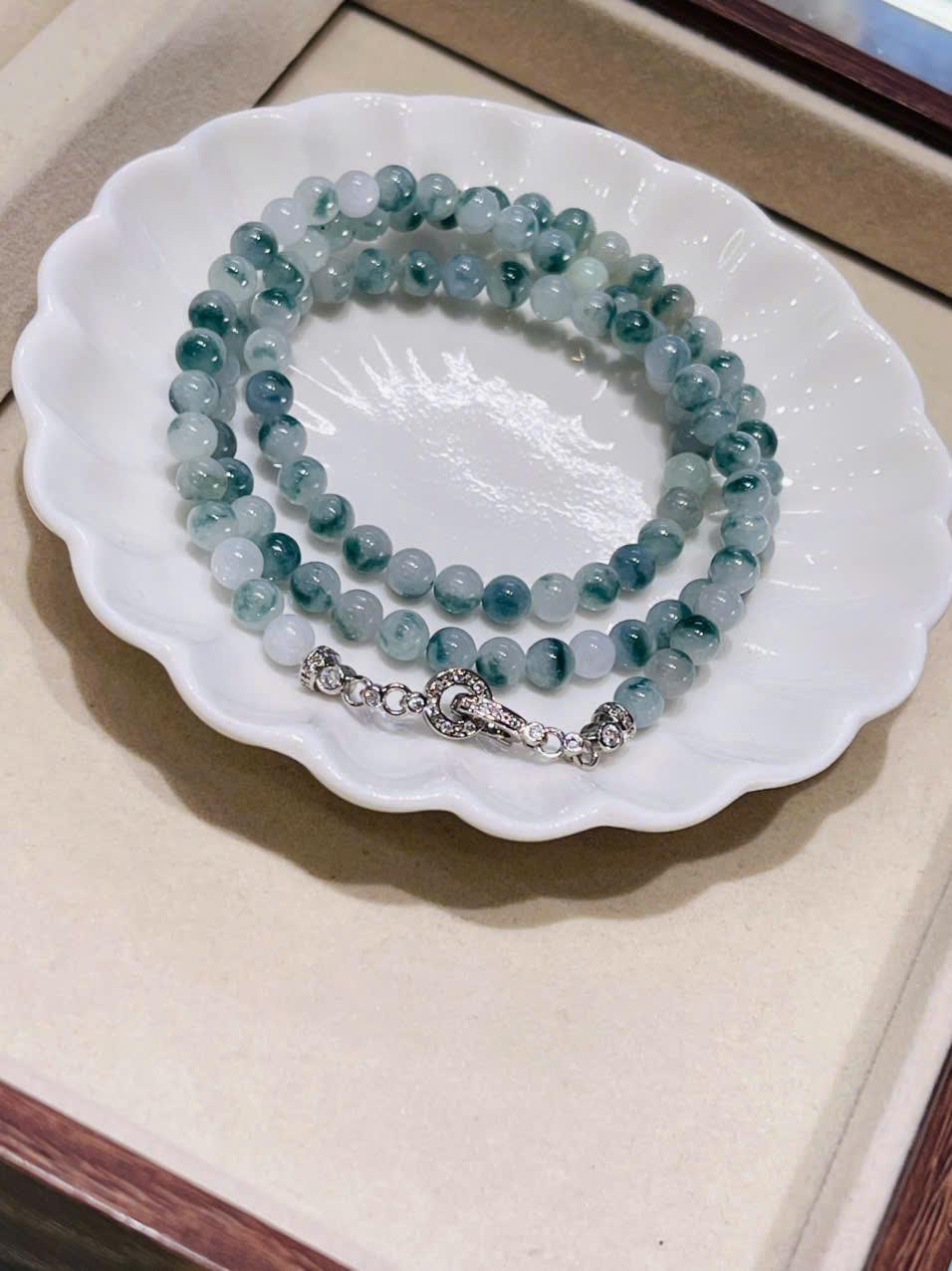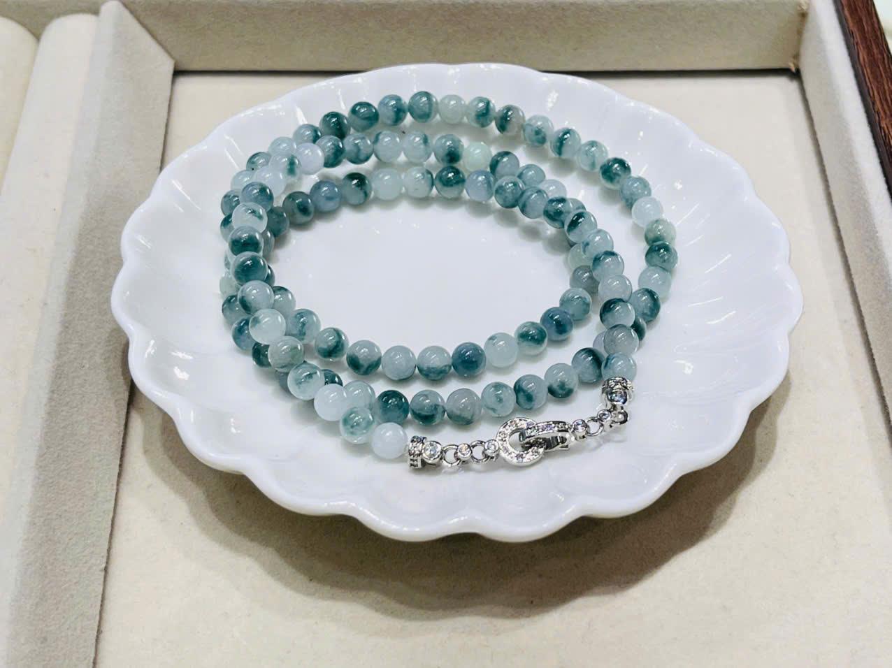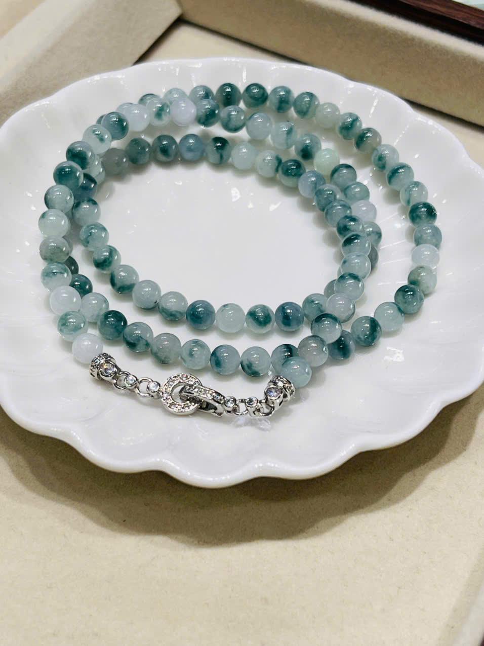 Điểm nổi bật chính là các vân “phiêu hoa” – những mảng xanh đậm nhạt đan xen một cách tự nhiên, không theo quy luật. Mỗi hạt là một sắc thái riêng, góp phần tạo nên sự độc bản cho từng chuỗi vòng. Chính yếu tố này khiến sản phẩm không chỉ là trang sức mà còn giống như một tác phẩm nghệ thuật thu nhỏ.
