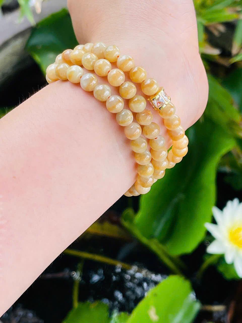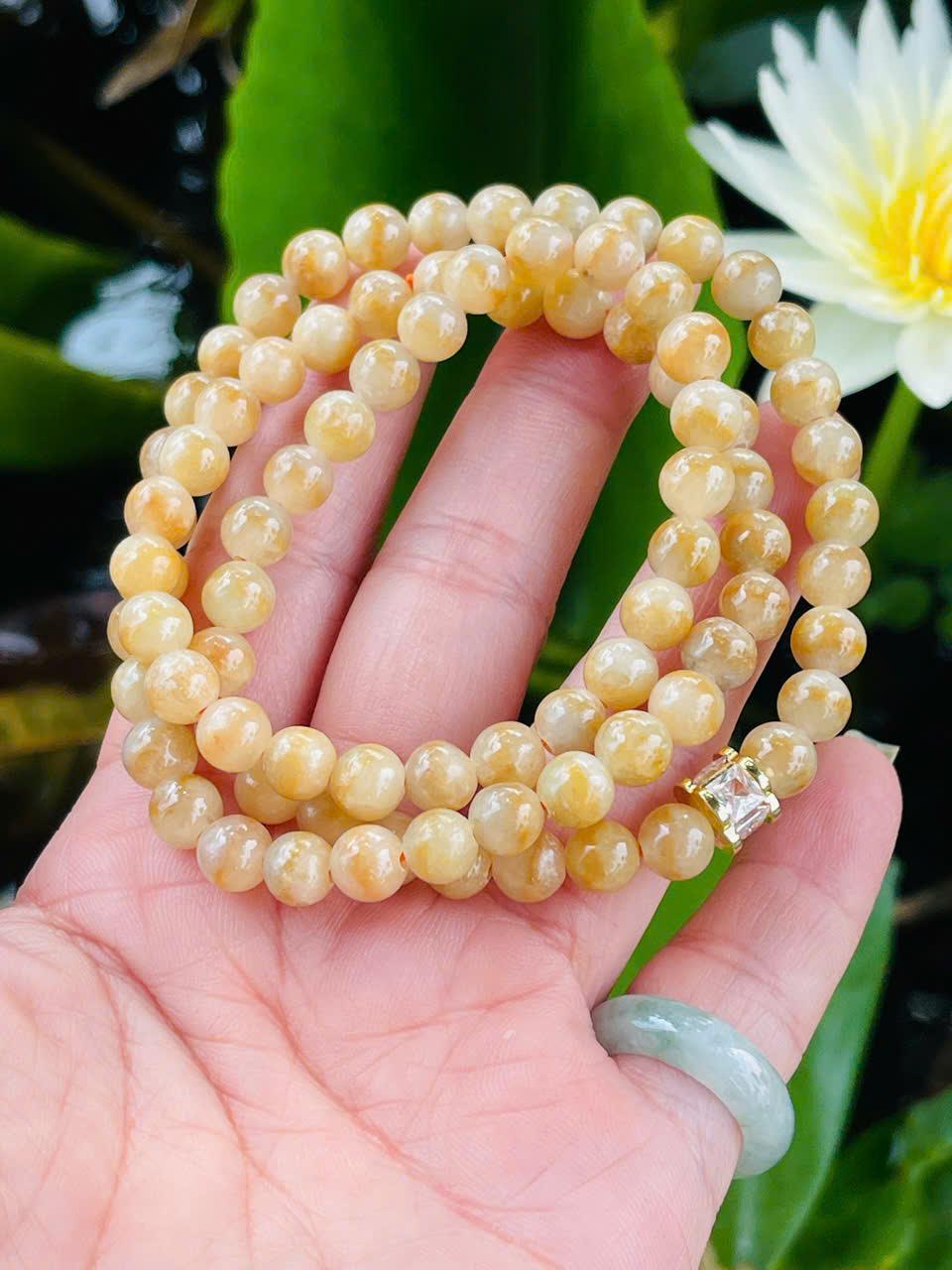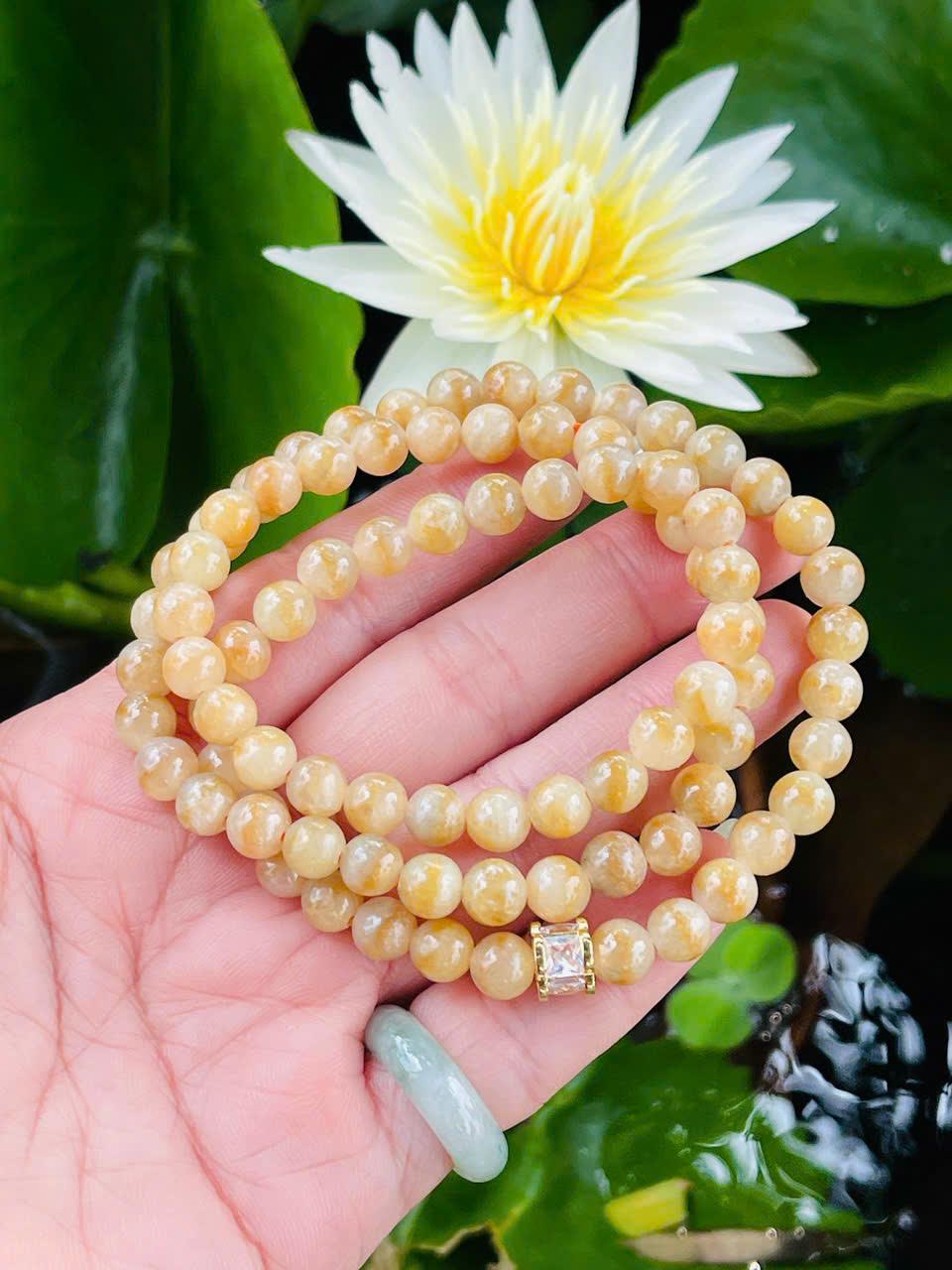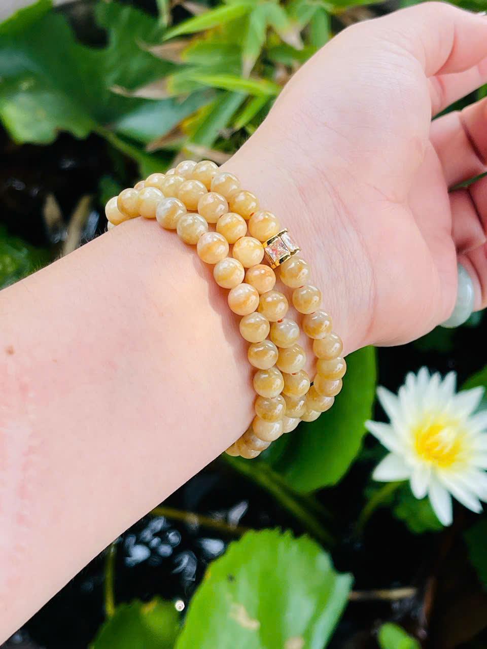 Ngay từ ánh nhìn đầu tiên, chuỗi vòng gây ấn tượng bởi màu vàng ngà pha ánh mật ong, có sự chuyển sắc tự nhiên giữa các hạt. Tông màu này không quá rực nhưng lại rất “có chiều sâu”, tạo cảm giác ấm áp, thanh lịch và dễ dàng thu hút ánh nhìn.
