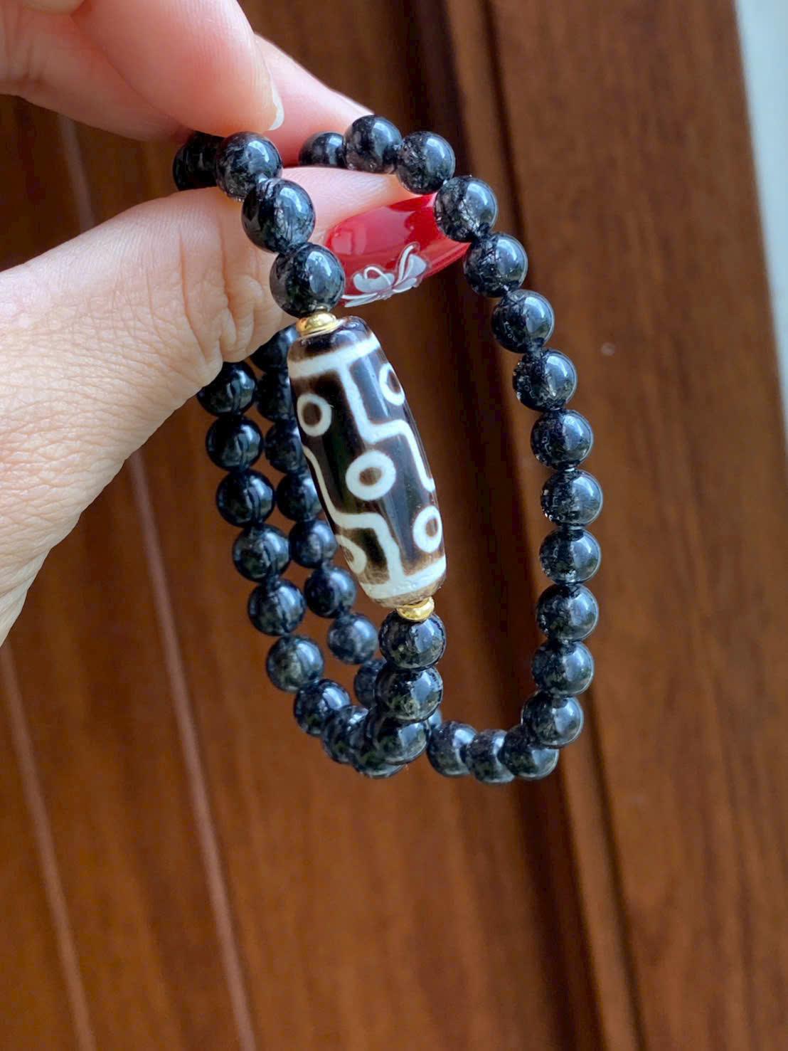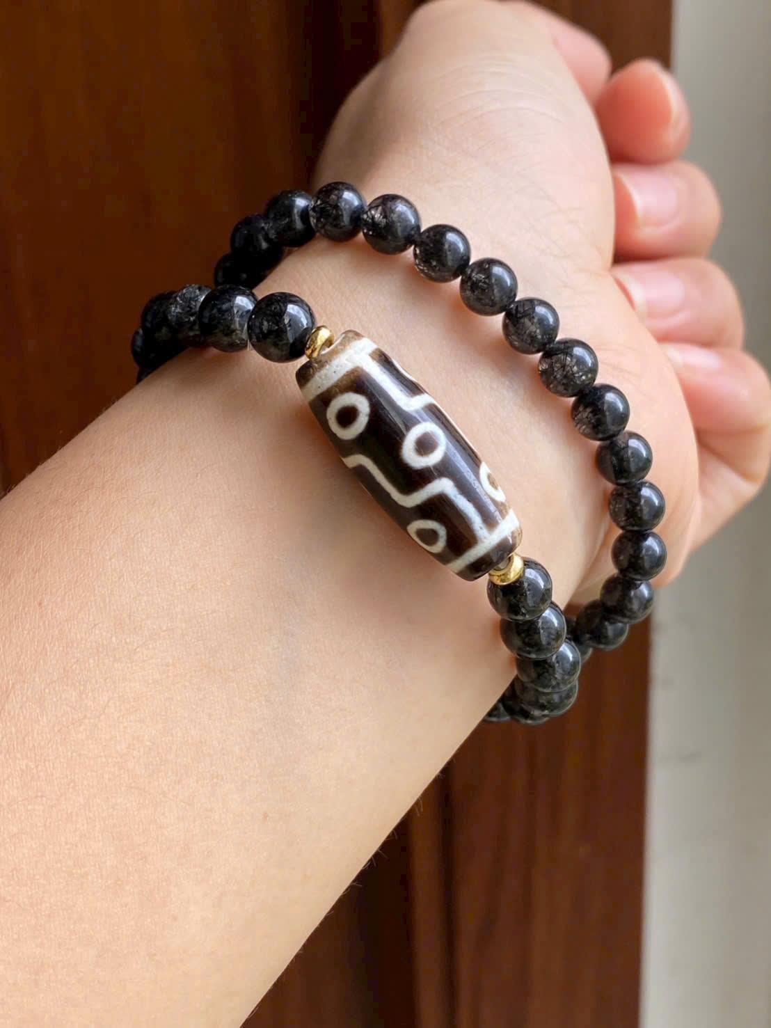 Sự kết hợp giữa Dzi 9 mắt và thạch anh tóc đen tạo thành một lá bùa hộ mệnh mạnh mẽ, giúp cân bằng năng lượng âm dương, thu hút tài lộc, mang lại may mắn và bình an dài lâu.