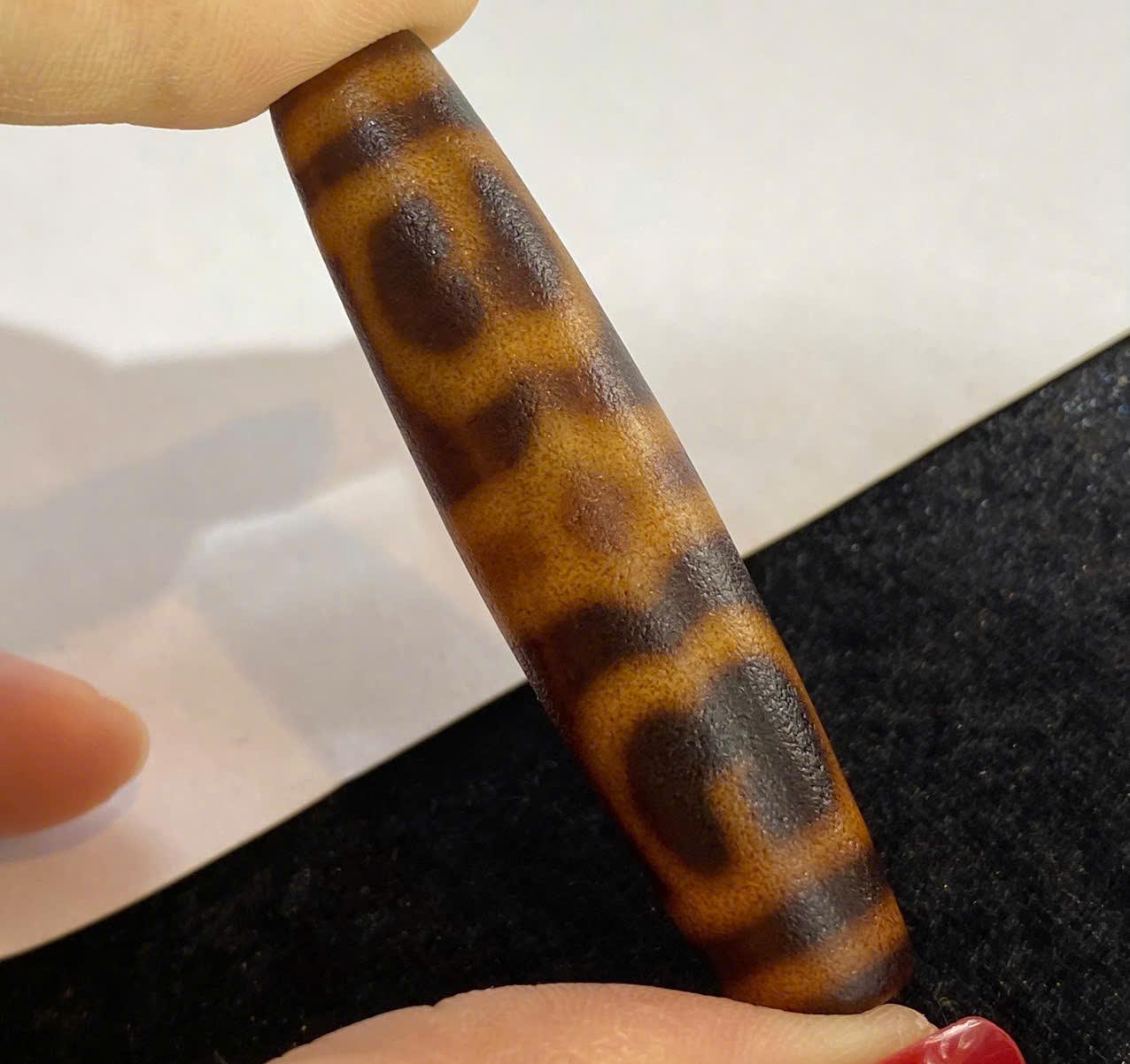 Viên dzi có form thon dài 5.74 cm, bề mặt bóng mịn, họa tiết hiện rõ và sắc màu chuyển đều từ vàng mật ong sang nâu trầm – đây là kiểu màu được rất nhiều người sưu tầm yêu thích vì mang đậm phong cách cổ điển Tây Tạng.