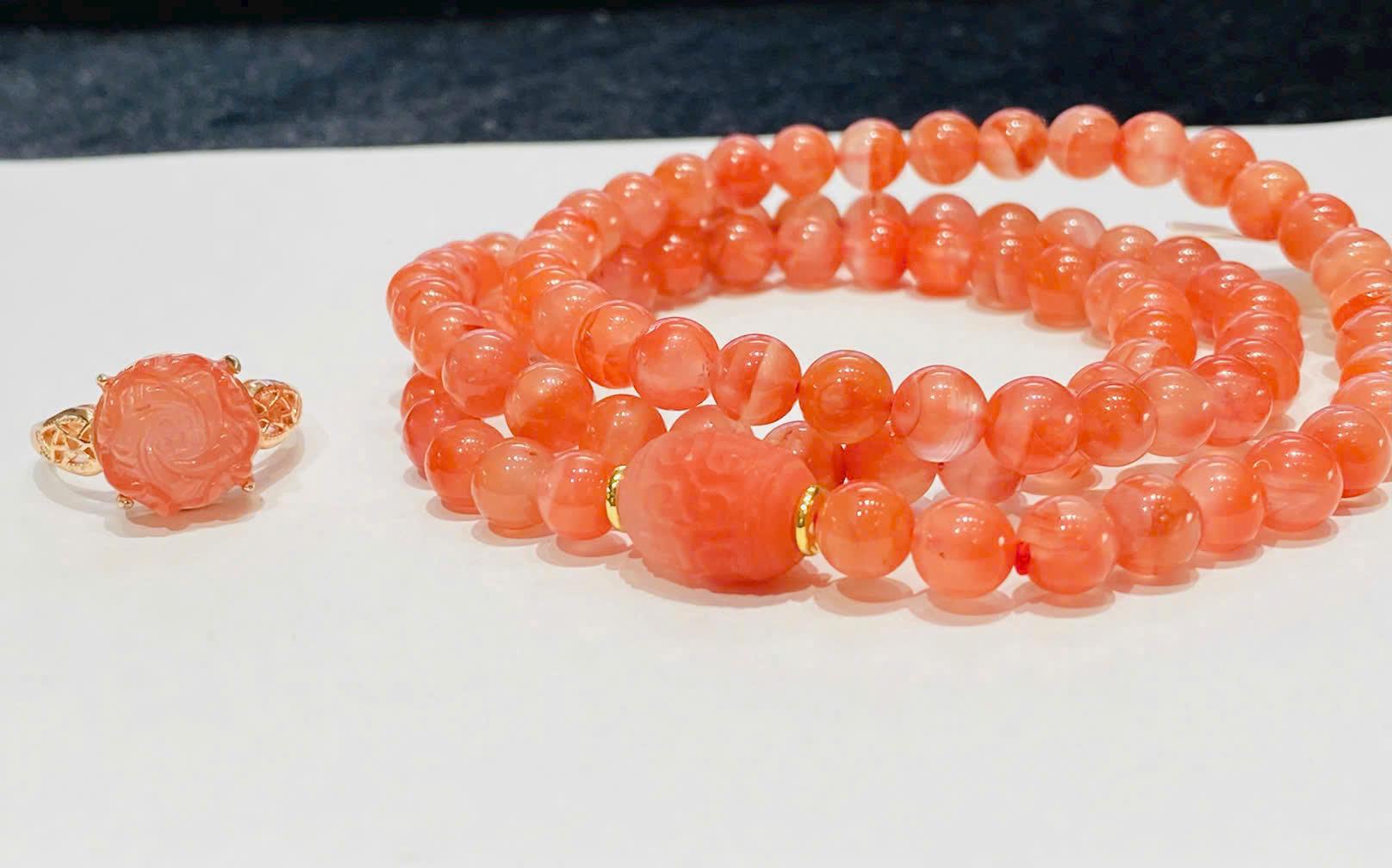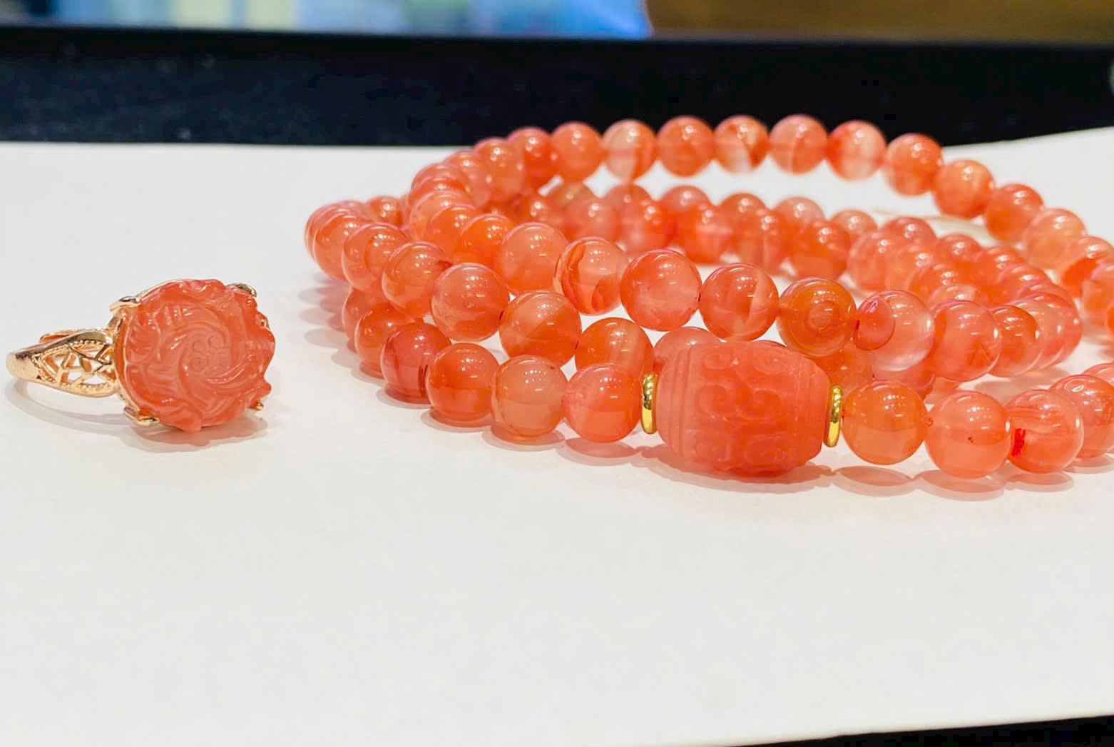Set Mã não nam hồng mix lu thống + nhẫn hoa là sự kết hợp hài hòa giữa sắc đá tự nhiên mềm mại và thiết kế trang sức tinh xảo. Tông hồng cam ấm áp, trong trẻo, mang đến cảm giác nhẹ nhàng nhưng vẫn nổi bật, rất phù hợp với những ai yêu thích phong cách thanh lịch, nữ tính và có chiều sâu.