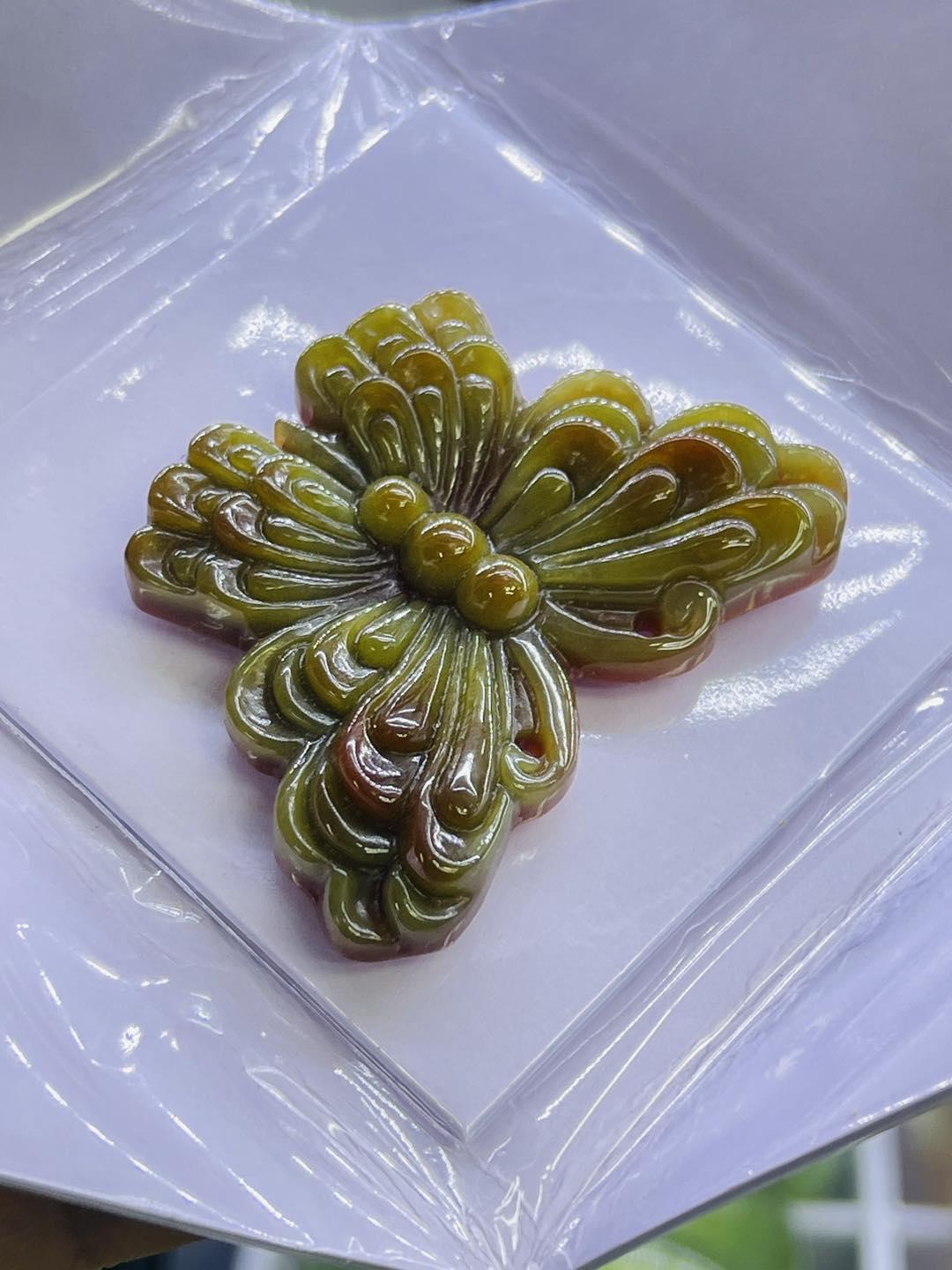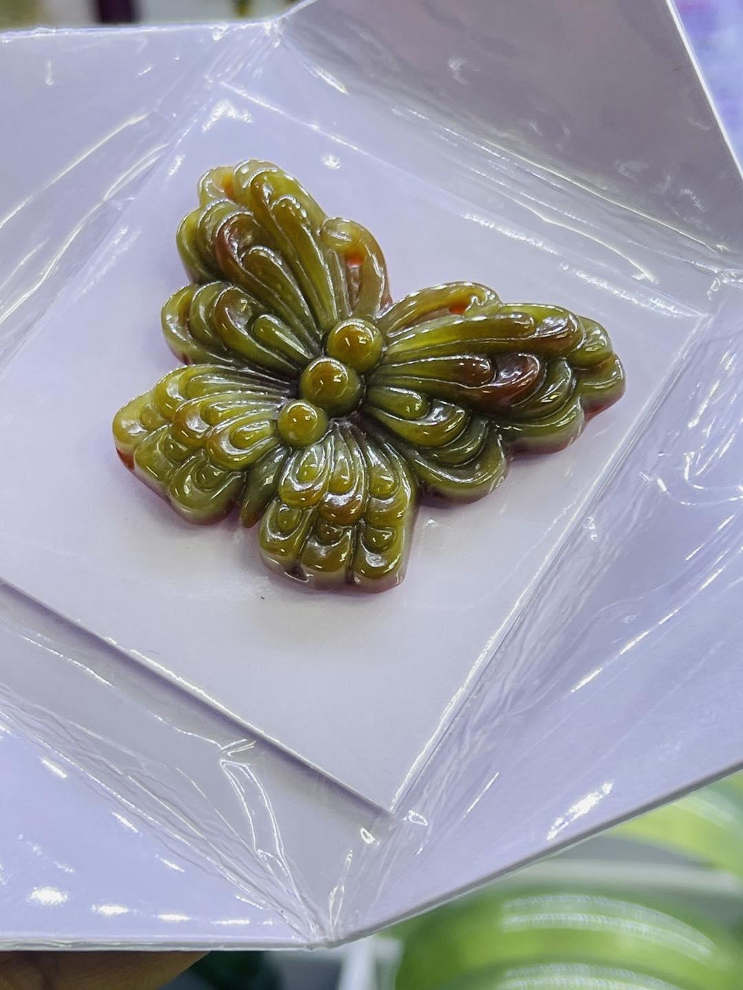 Sắc ngọc huyết đặc trưng với tông xanh rêu pha nâu đỏ tự nhiên, tạo nên hiệu ứng màu sắc sống động, có chiều sâu, càng ngắm càng thấy cuốn hút. Dưới bàn tay chế tác khéo léo của nghệ nhân, từng đường nét trên mặt hồ điệp được chạm khắc mềm mại, cân đối, làm nổi bật vẻ đẹp thuần khiết và giá trị nghệ thuật cao của viên ngọc.