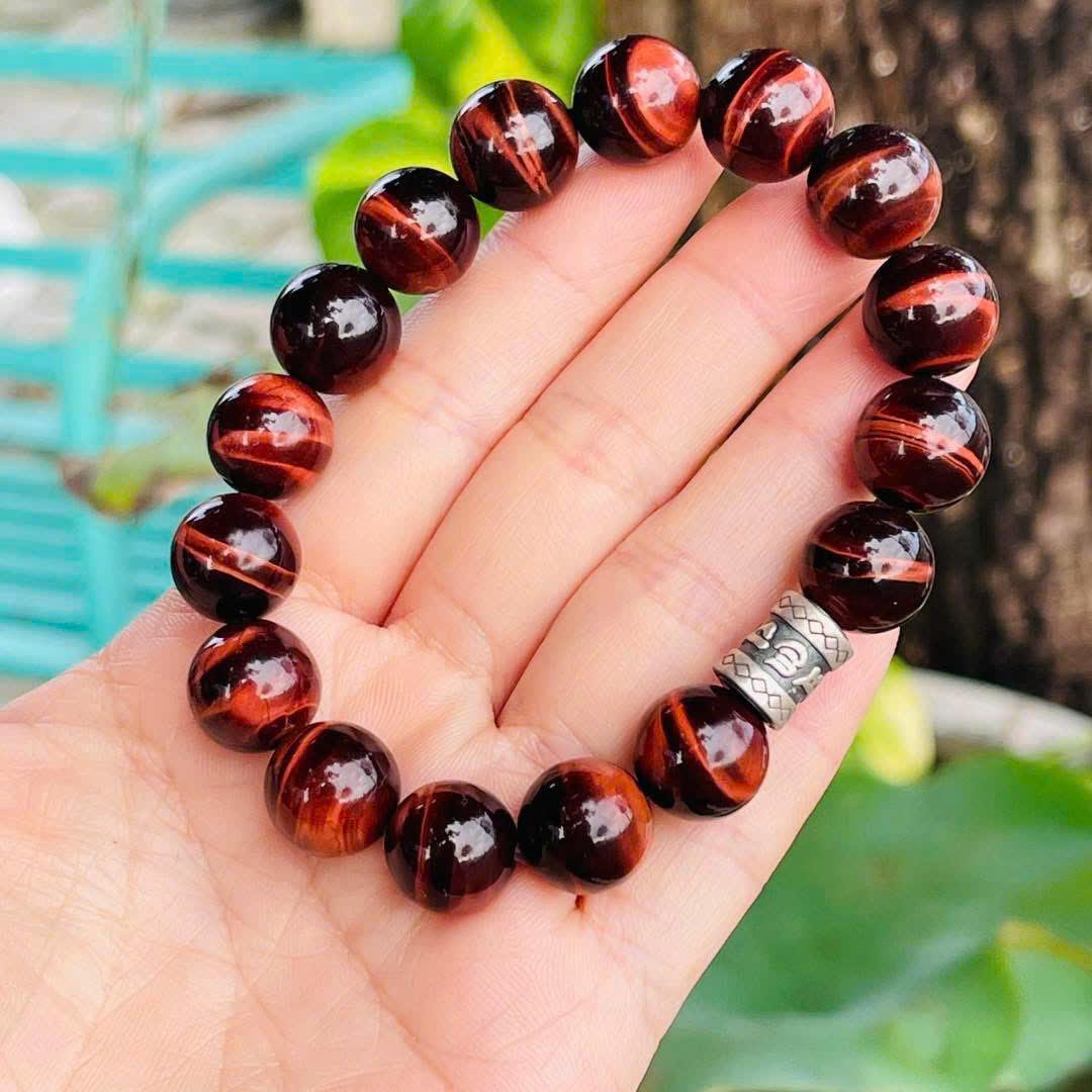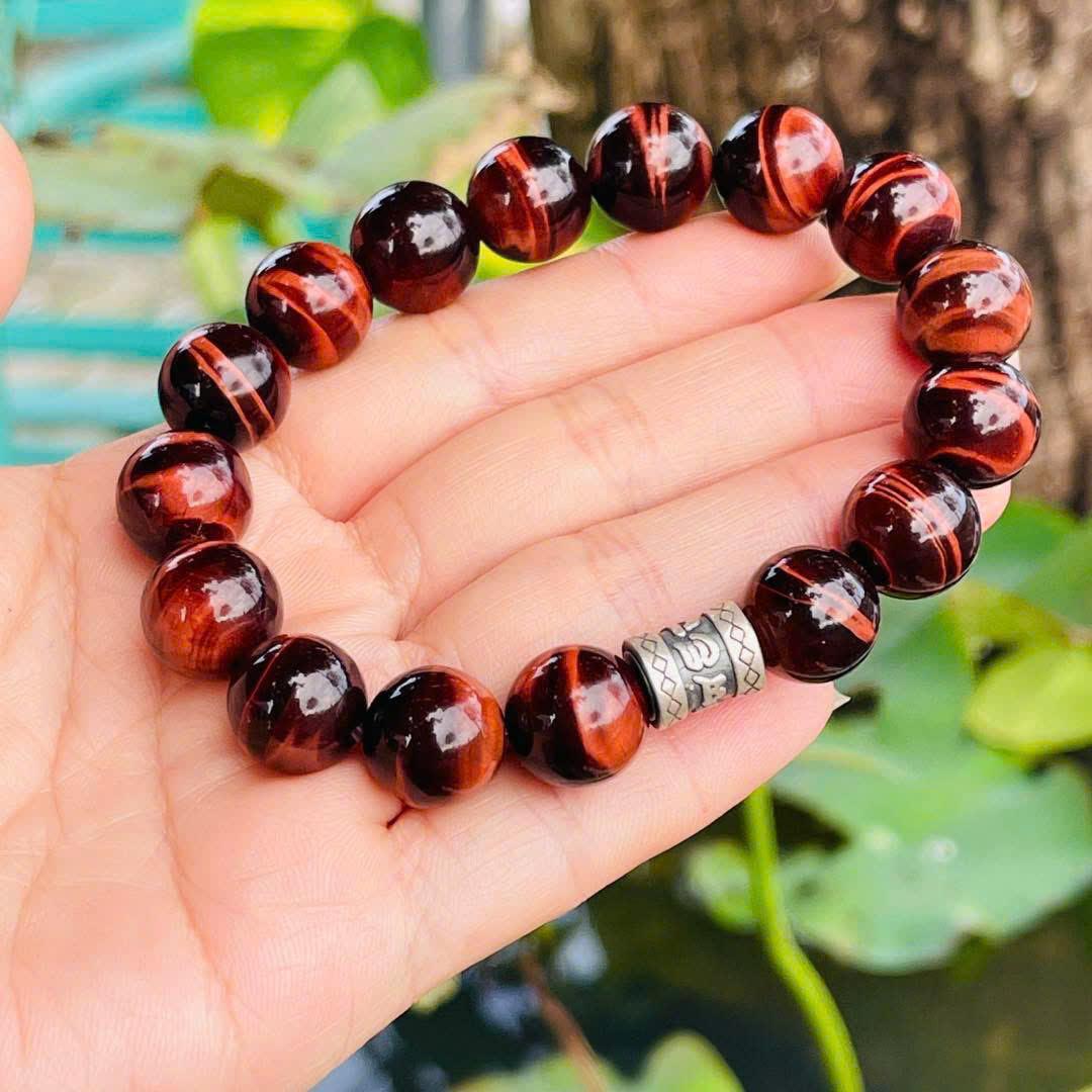 Chuỗi vòng tay Mắt Hổ Đỏ Vip 12 li mix lu bạc khắc chú là một trong những dòng trang sức phong thủy được đánh giá cao bởi sự kết hợp tinh tế giữa vẻ đẹp tự nhiên của đá quý và ý nghĩa tâm linh sâu sắc. Mắt Hổ đỏ từ lâu đã được biết đến như biểu tượng của sức mạnh nội tâm, lòng dũng cảm và sự tỉnh táo. Khi ánh sáng chiếu lên từng hạt đá, hiệu ứng mắt hổ óng ánh như chuyển động, tạo nên nét huyền ảo đầy cuốn hút. Đây không chỉ là vẻ đẹp bề ngoài, mà còn là dấu hiệu cho thấy cấu trúc quang học đặc biệt của loại đá này – điều làm nên giá trị và sự quý hiếm của Mắt Hổ đỏ. Chuỗi hạt 12 li mang lại cảm giác chắc tay, sang trọng và nổi bật khi đeo, phù hợp với những ai yêu thích sự mạnh mẽ nhưng vẫn muốn giữ sự tinh tế trong phong cách.