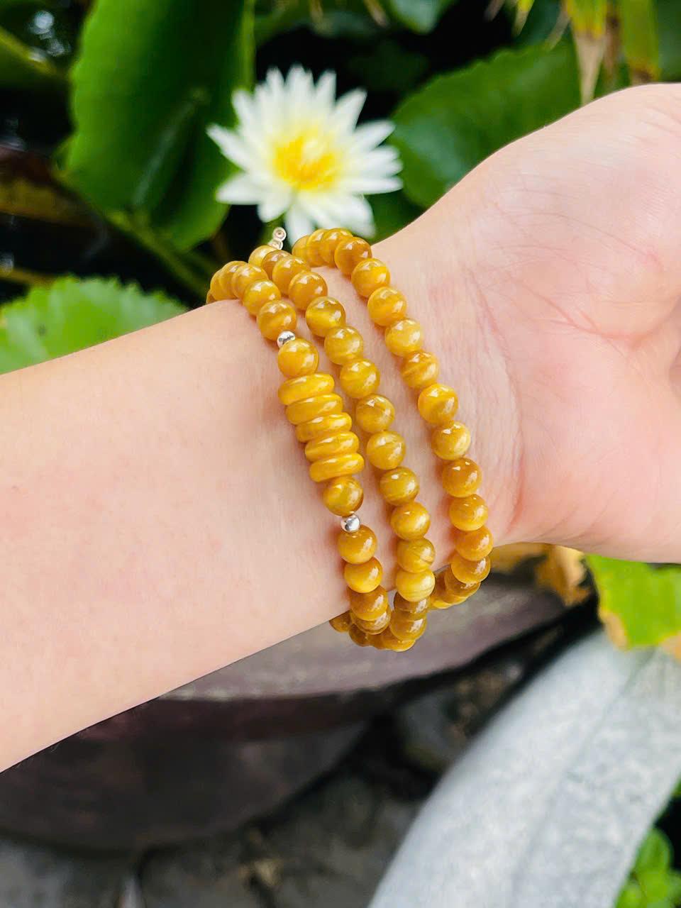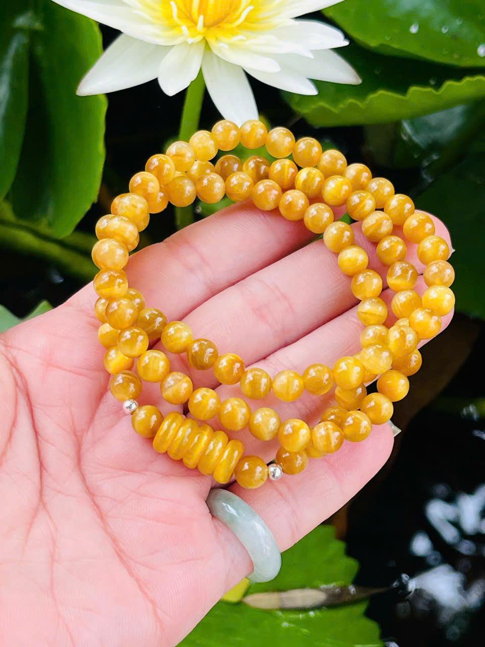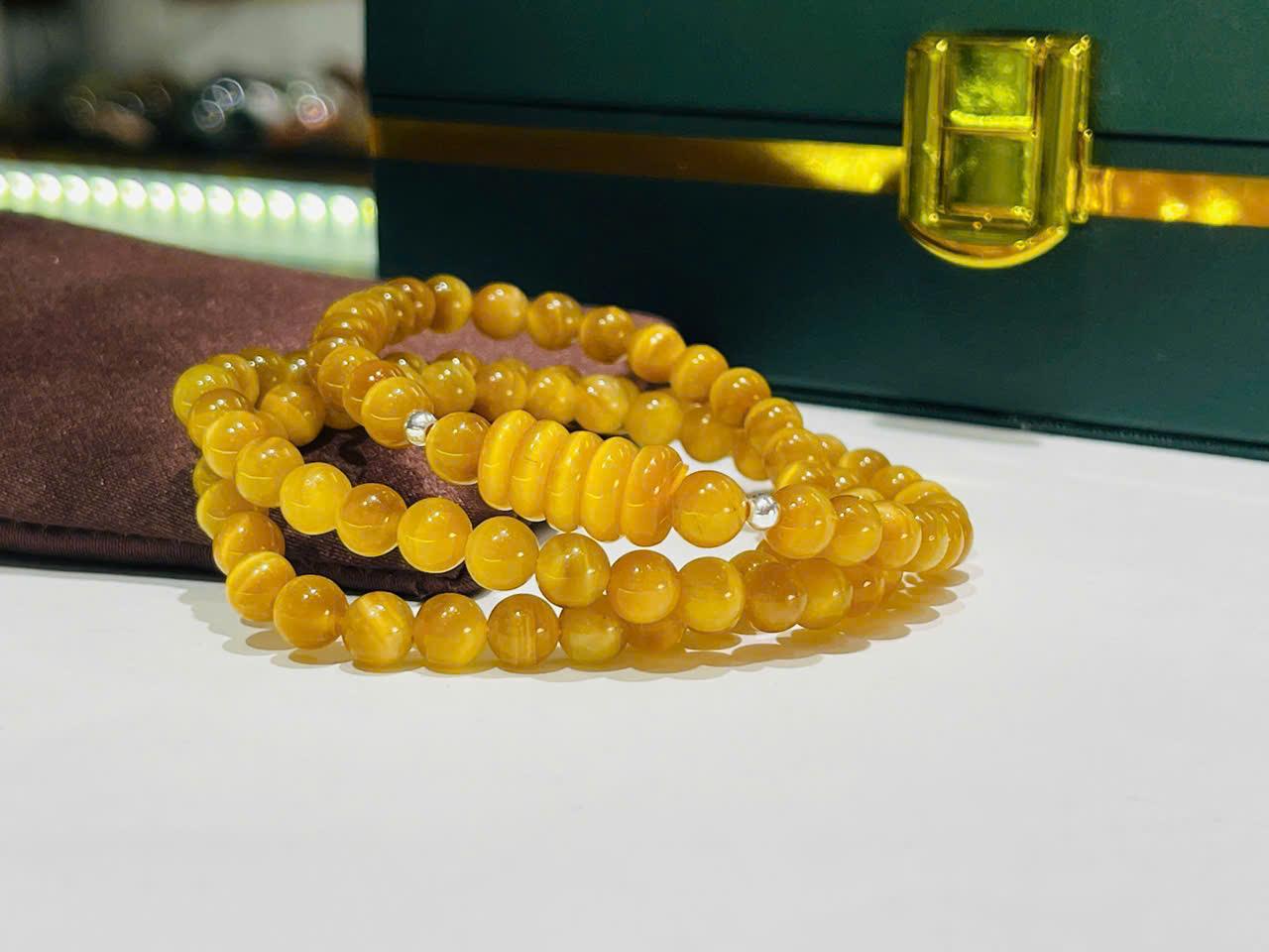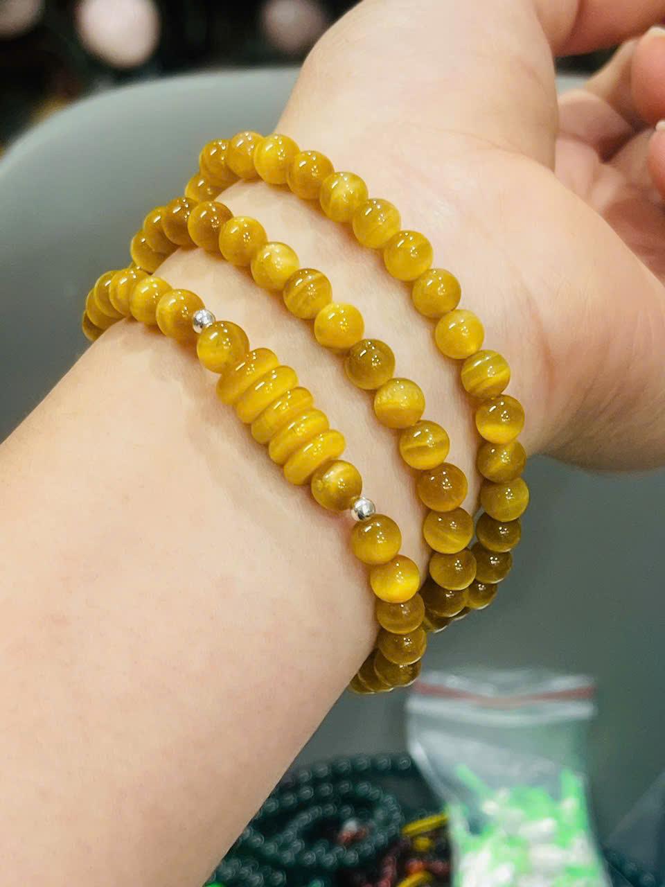 Ngay từ cái nhìn đầu tiên, chuỗi vòng gây ấn tượng với màu vàng mật ong óng ánh, các hạt đá tròn đều, bóng mịn. Hiệu ứng ánh lụa đặc trưng của mắt hổ tạo nên những dải sáng chuyển động mềm mại khi thay đổi góc nhìn, giúp tổng thể sản phẩm luôn sống động và có chiều sâu.