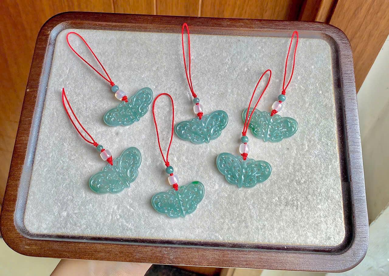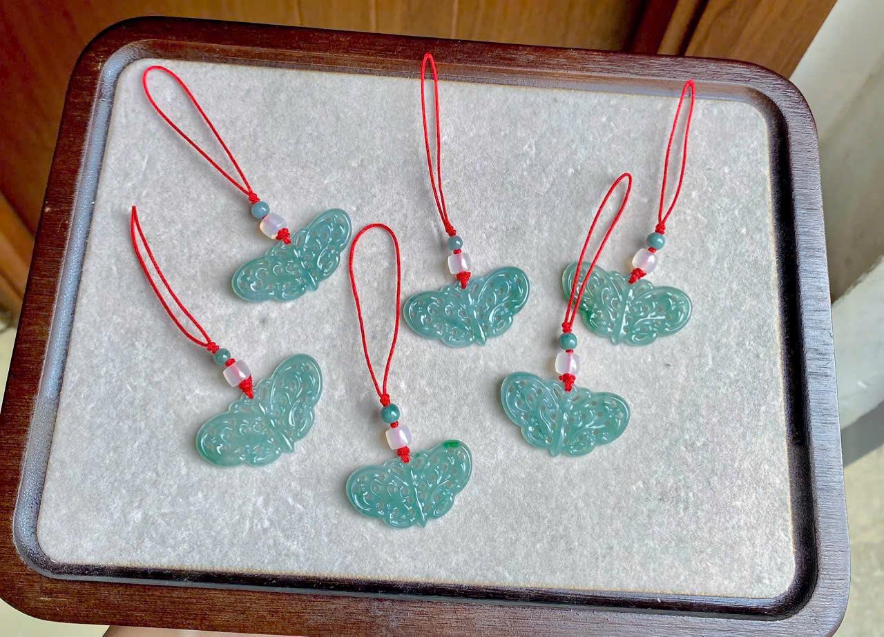 Mỗi chiếc móc khóa hồ điệp cao băng lam ngọc đều được chế tác thủ công tỉ mỉ, các đường nét trên cánh bướm mềm mại, uyển chuyển, thể hiện kỹ thuật khắc chạm tinh tế. Sự kết hợp giữa dây đỏ và các hạt trang trí nhỏ bằng đá tự nhiên tạo nên tổng thể hài hòa, mang đến cảm giác sang trọng nhưng vẫn gần gũi.