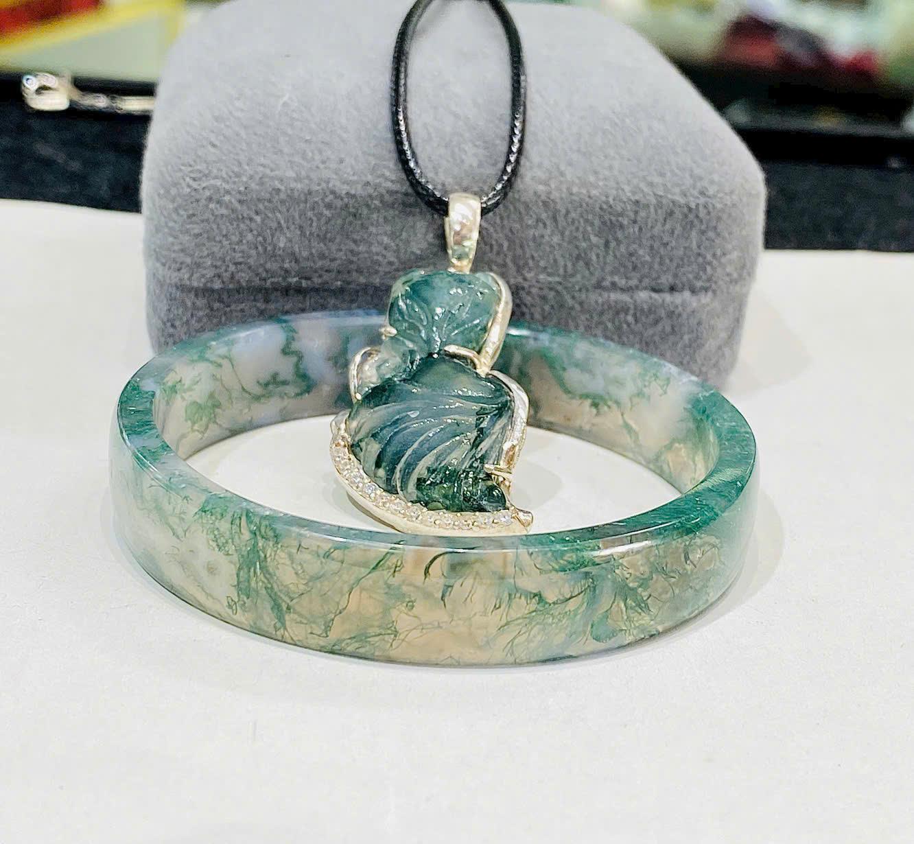 Ngọc thủy tảo từ lâu được xem là dòng ngọc mang năng lượng thanh lọc và cân bằng, giúp người đeo cảm thấy nhẹ nhàng hơn trong tâm trí, giảm căng thẳng, mang lại cảm giác an yên và ổn định cảm xúc. Sắc xanh rêu dịu mắt không quá nổi bật nhưng càng ngắm càng sâu, phù hợp với những ai yêu vẻ đẹp tinh tế, trầm lắng và bền lâu theo thời gian.