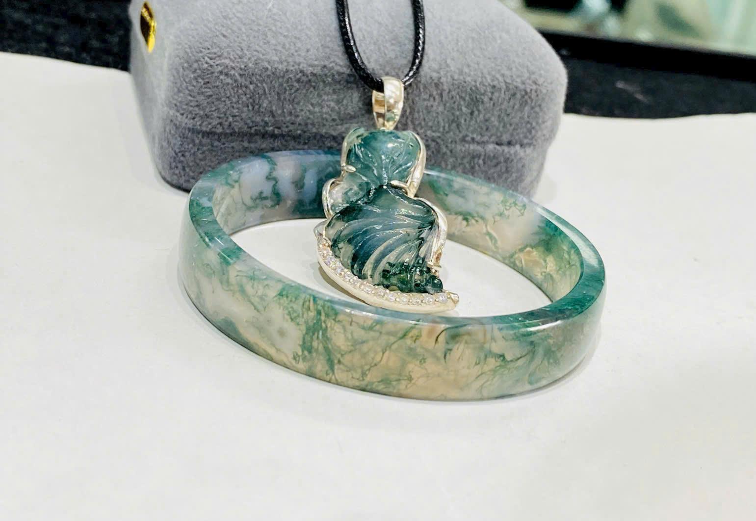 Ngay từ ánh nhìn đầu tiên, set ngọc gây ấn tượng bởi sắc xanh rêu pha nền ngọc sữa, trong veo nhưng không đơn điệu. Những đường vân thủy tảo lan tỏa tự nhiên bên trong khối ngọc, mềm mại như rêu nước, như mây khói trôi nhẹ, tạo cảm giác thanh thoát, mát lành và rất “có hồn”. Mỗi chiếc vòng và mặt hồ ly đều mang hoa văn khác nhau, không chiếc nào trùng lặp, đúng chất ngọc thiên nhiên – mỗi món là một bản thể riêng biệt.