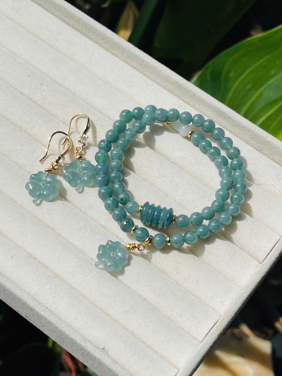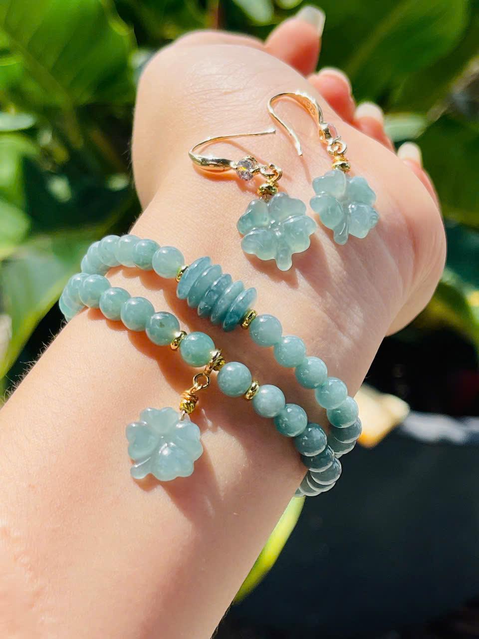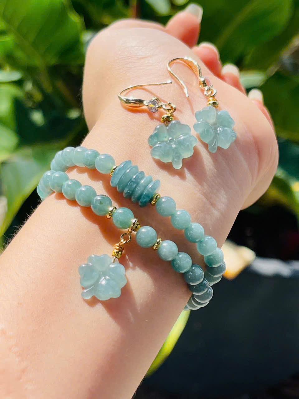 Set bộ cỏ 4 lá nếp hoá băng là sự kết hợp tinh tế giữa vòng tay và đôi bông tai được chế tác từ đá tự nhiên có sắc xanh trong trẻo như giọt sương sớm. Mỗi chi tiết đều được hoàn thiện tỉ mỉ, tôn lên vẻ nhẹ nhàng, thanh thoát nhưng vẫn sang trọng cho người đeo. Với hình dáng cỏ 4 lá – biểu tượng của sự may mắn, bộ trang sức này mang đến cảm giác an yên và niềm tin vào những điều tốt đẹp trong cuộc sống.