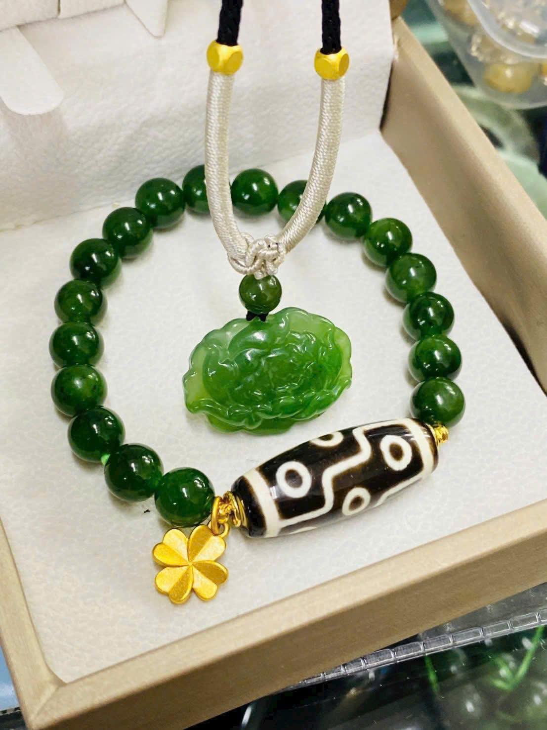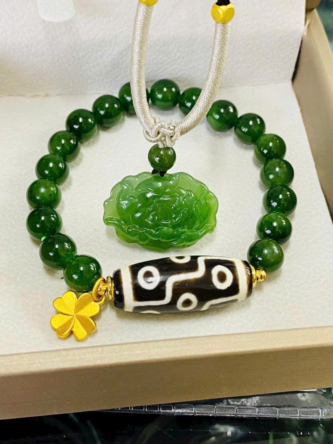 Từng hạt ngọc bích xanh thẫm ánh lục như giọt sương tinh khiết của núi rừng, bao bọc quanh viên Dzi 9 mắt mang hoa văn huyền bí – biểu tượng của sự viên mãn, thành công và quyền lực. Mỗi chi tiết đều được chế tác tỉ mỉ, hài hòa giữa yếu tố phong thủy và tính nghệ thuật, tạo nên một tổng thể sang trọng, thanh cao và đầy năng lượng.