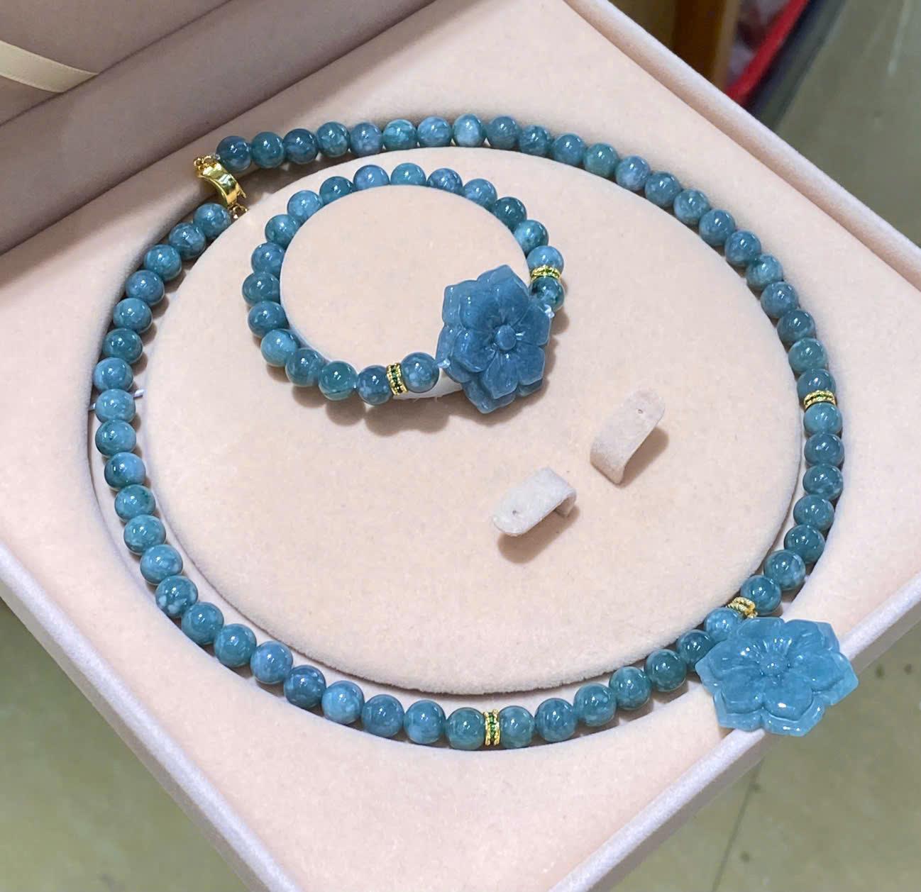 Thiết kế hoa mai làm điểm nhấn giúp set trang sức thêm phần nổi bật, phù hợp với nhiều phong cách thời trang, từ trang phục công sở thanh lịch đến váy áo dự tiệc nhẹ nhàng. Khi đeo lên tay và cổ, set lam ngọc giúp tôn lên làn da, tạo cảm giác tươi tắn, rạng rỡ và cuốn hút.