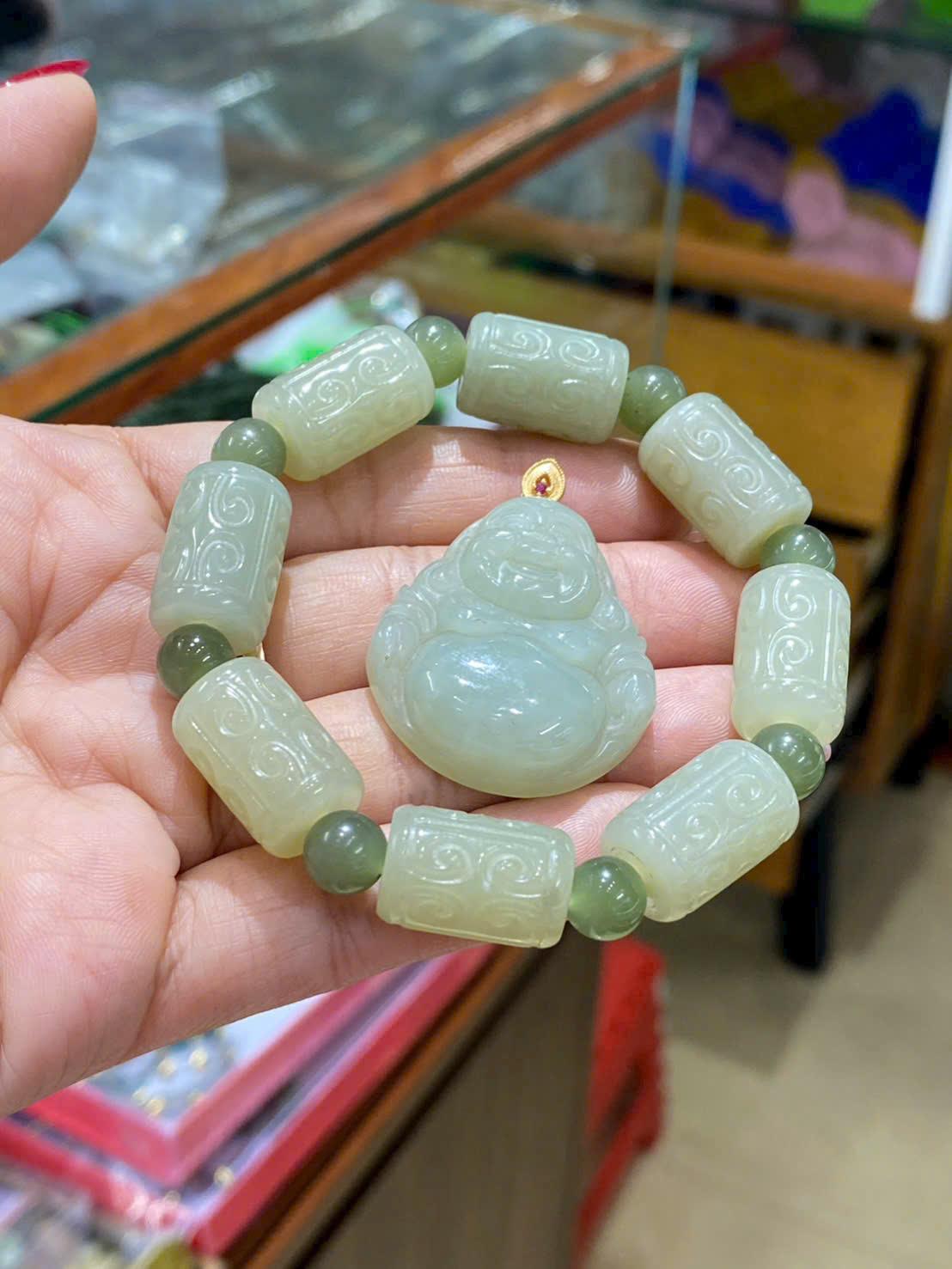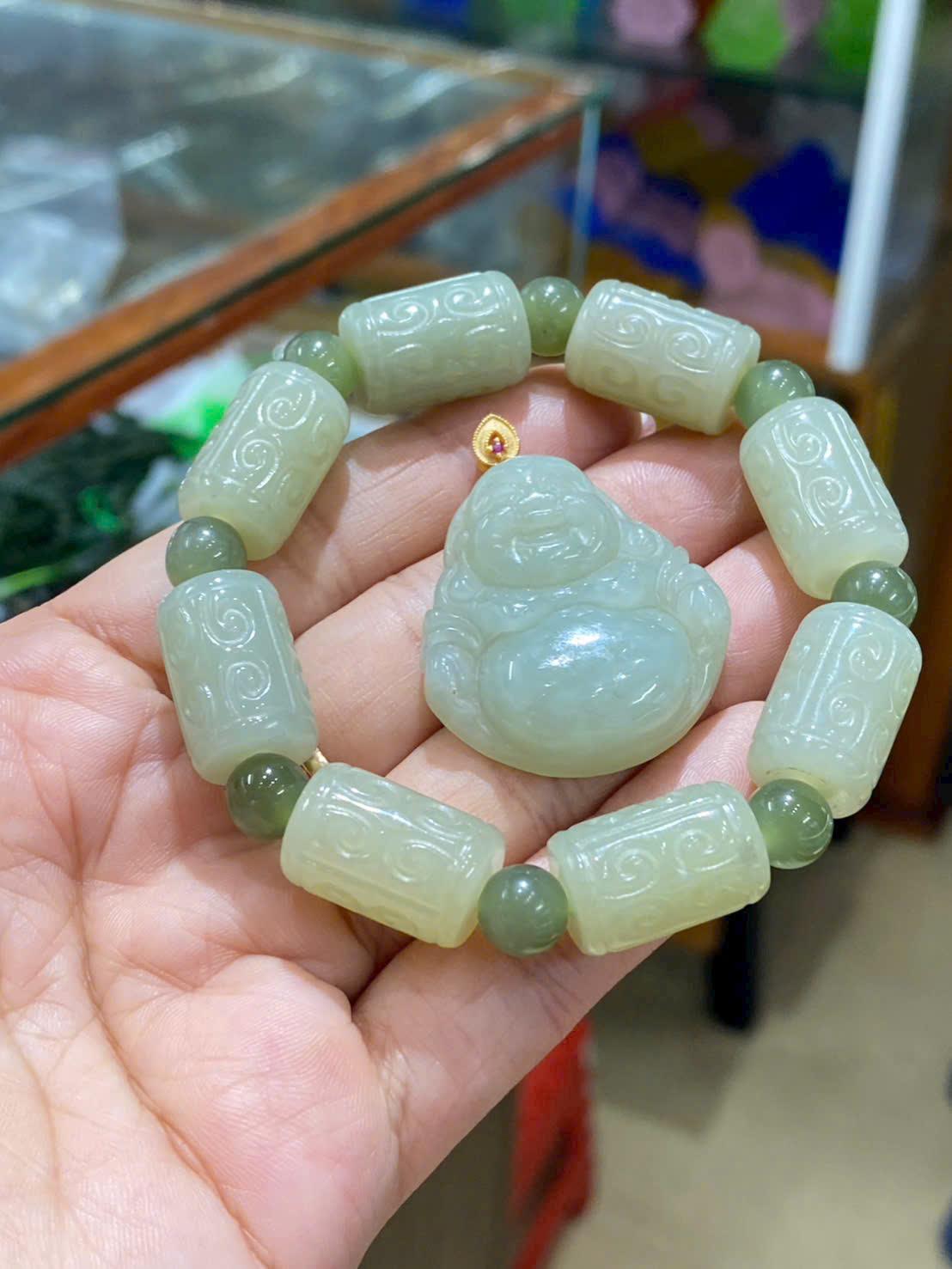 Đặc biệt, hình tượng Phật Di Lặc đại diện cho niềm vui, sự hỷ xả và phúc lộc viên mãn. Khi kết hợp cùng ngọc Hòa Điền, bộ trang sức trở thành vật phẩm phong thủy mang ý nghĩa chiêu tài, hóa giải muộn phiền, mang đến cuộc sống an nhiên, thịnh vượng và sung túc.