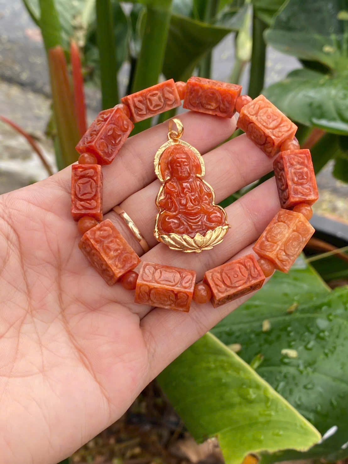 Mặt dây chuyền Phật ngọc huyết là điểm nhấn trung tâm của set, mang giá trị tâm linh đặc biệt. Hình tượng Phật đại diện cho trí tuệ, từ bi, bình an và giác ngộ, giúp người đeo giữ được tâm an, hướng thiện và sống tích cực hơn mỗi ngày.