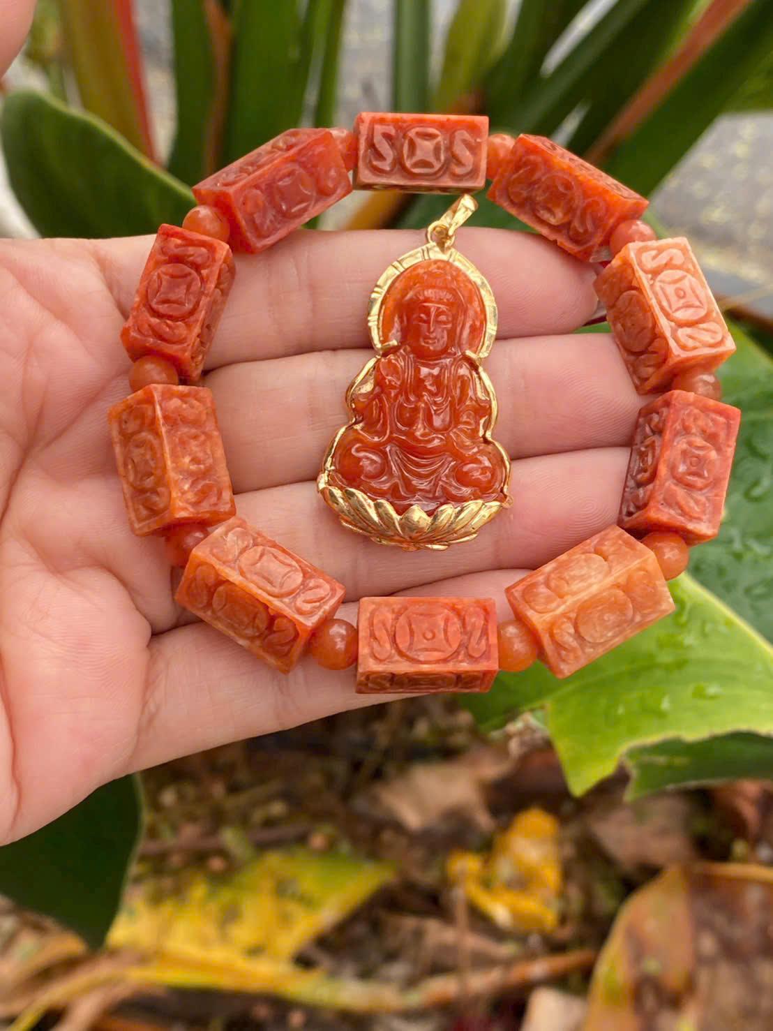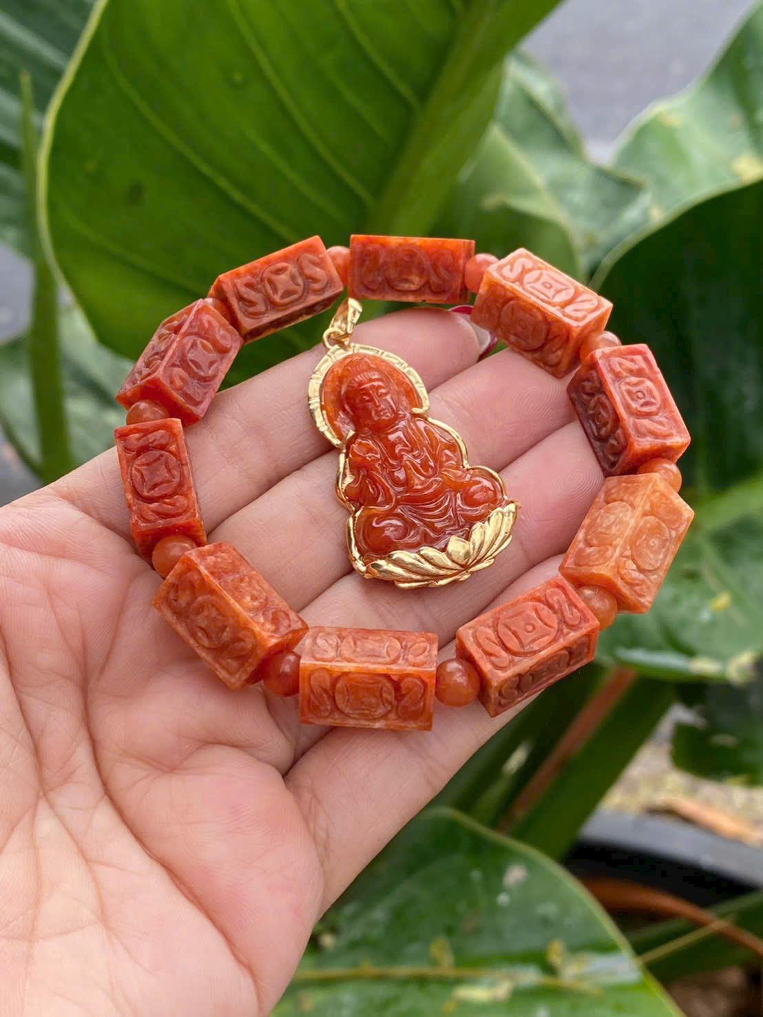 Tông màu đỏ cam đặc trưng của ngọc huyết không chỉ tạo ấn tượng thị giác mạnh mẽ mà còn tượng trưng cho sinh khí, tài lộc, thịnh vượng và sự bảo hộ. Bộ trang sức này đặc biệt phù hợp với những ai yêu thích phong thủy, mong cầu bình an, may mắn và thành công trong công việc lẫn cuộc sống.