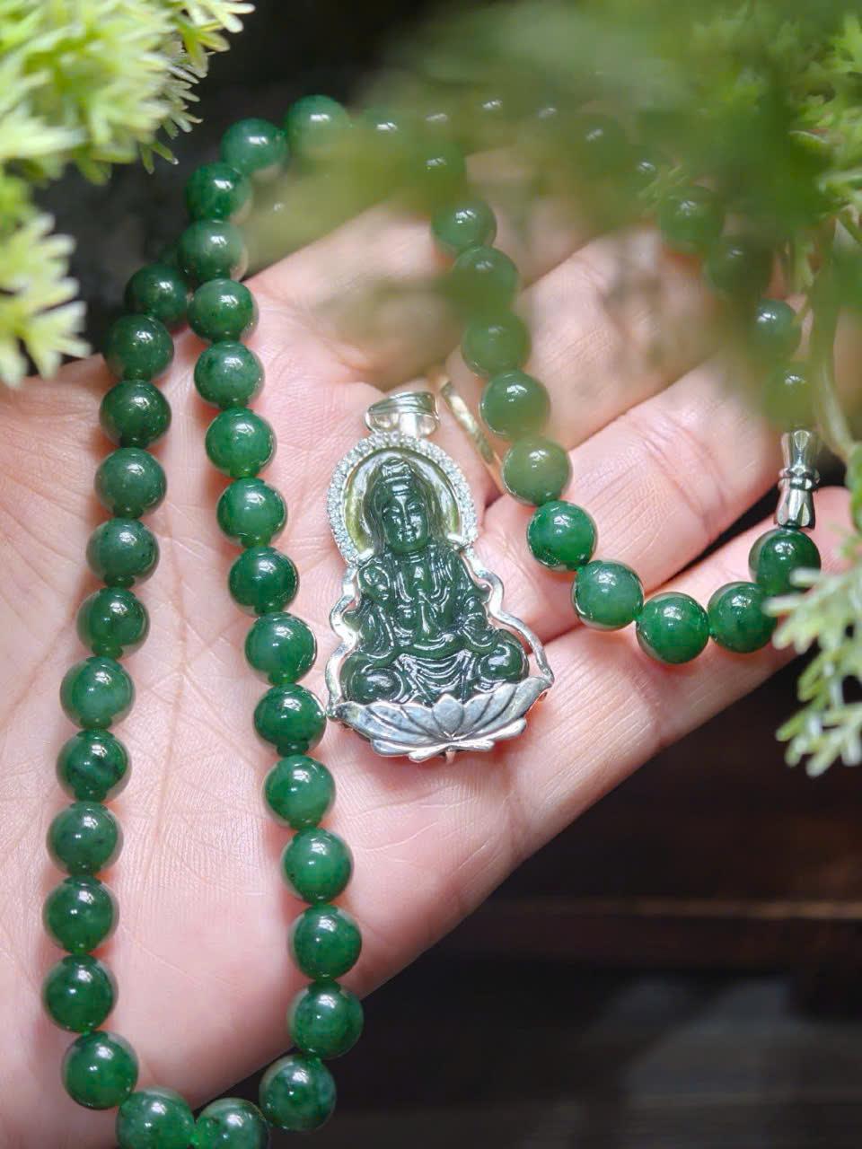 Set vòng cổ ngọc bích kết hợp mặt Quan Âm lên bạc là thiết kế mang đậm giá trị tâm linh và thẩm mỹ, dành cho những ai tìm kiếm sự bình an trong cuộc sống. Sự hòa quyện giữa sắc xanh trầm của ngọc bích và ánh bạc tinh tế tạo nên một tổng thể vừa trang nghiêm, vừa gần gũi.