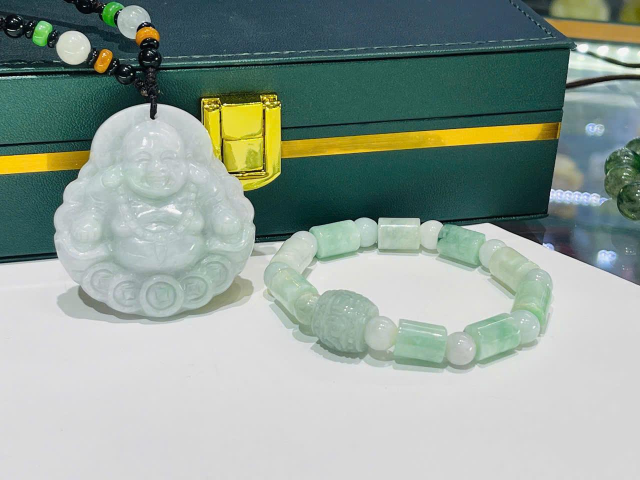 Ngay từ ánh nhìn đầu tiên, set trang sức gây ấn tượng bởi sắc xanh ngọc dịu nhẹ, pha chút trắng trong, tạo cảm giác mát lành và tinh khiết. Các chi tiết được chế tác đồng bộ, từ mặt Di Lặc đến vòng tay, mang lại sự thống nhất và tinh tế trong tổng thể.