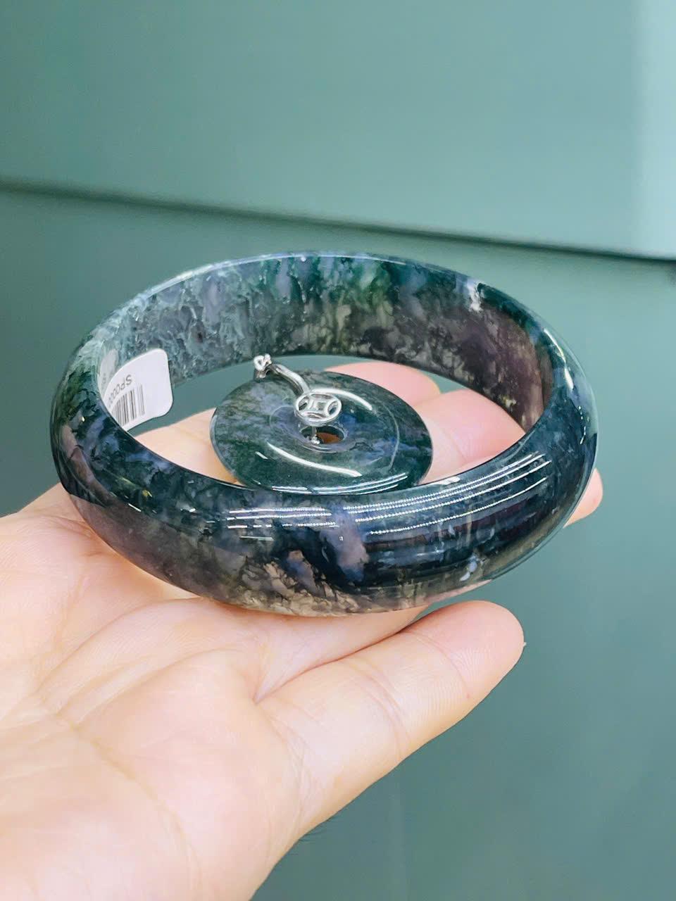 Kích thước size 56.4 phù hợp với cổ tay trung bình, vừa vặn và sang trọng. Bộ set đi kèm mặt đá tròn (hoặc donut) mang ý nghĩa vòng tròn viên mãn, tượng trưng cho sự đầy đủ, bảo vệ và hanh thông. Khi đeo cùng nhau, vòng và mặt thủy tảo tạo thành một tổng thể hài hòa – vừa là món trang sức tinh tế, vừa là “bùa hộ mệnh” giúp thu hút năng lượng tích cực.
