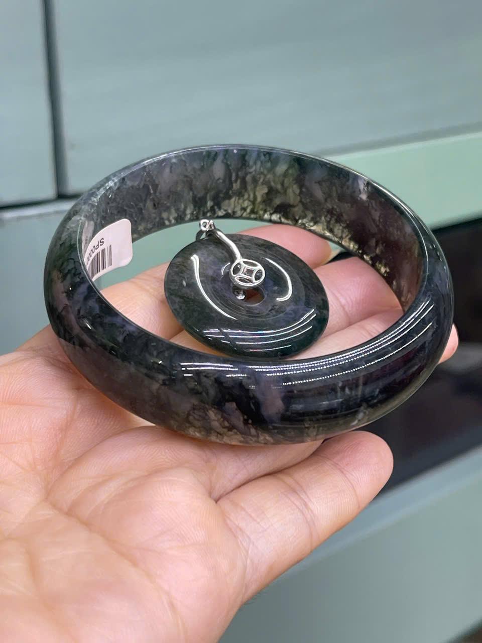 Set vòng tay và mặt thủy tảo size 56.4 sở hữu tông màu trầm pha lẫn sắc xanh, tím, xám và khói đen – vừa bí ẩn, vừa cuốn hút. Khi có ánh sáng chiếu vào, đá ánh lên độ trong suốt kỳ diệu, để lộ từng sợi tảo mềm mại, như một khu rừng nhỏ ẩn mình trong viên ngọc. Đây chính là vẻ đẹp mà giới sưu tầm đá quý đánh giá cao – sự tinh tế trong từng chi tiết tự nhiên.