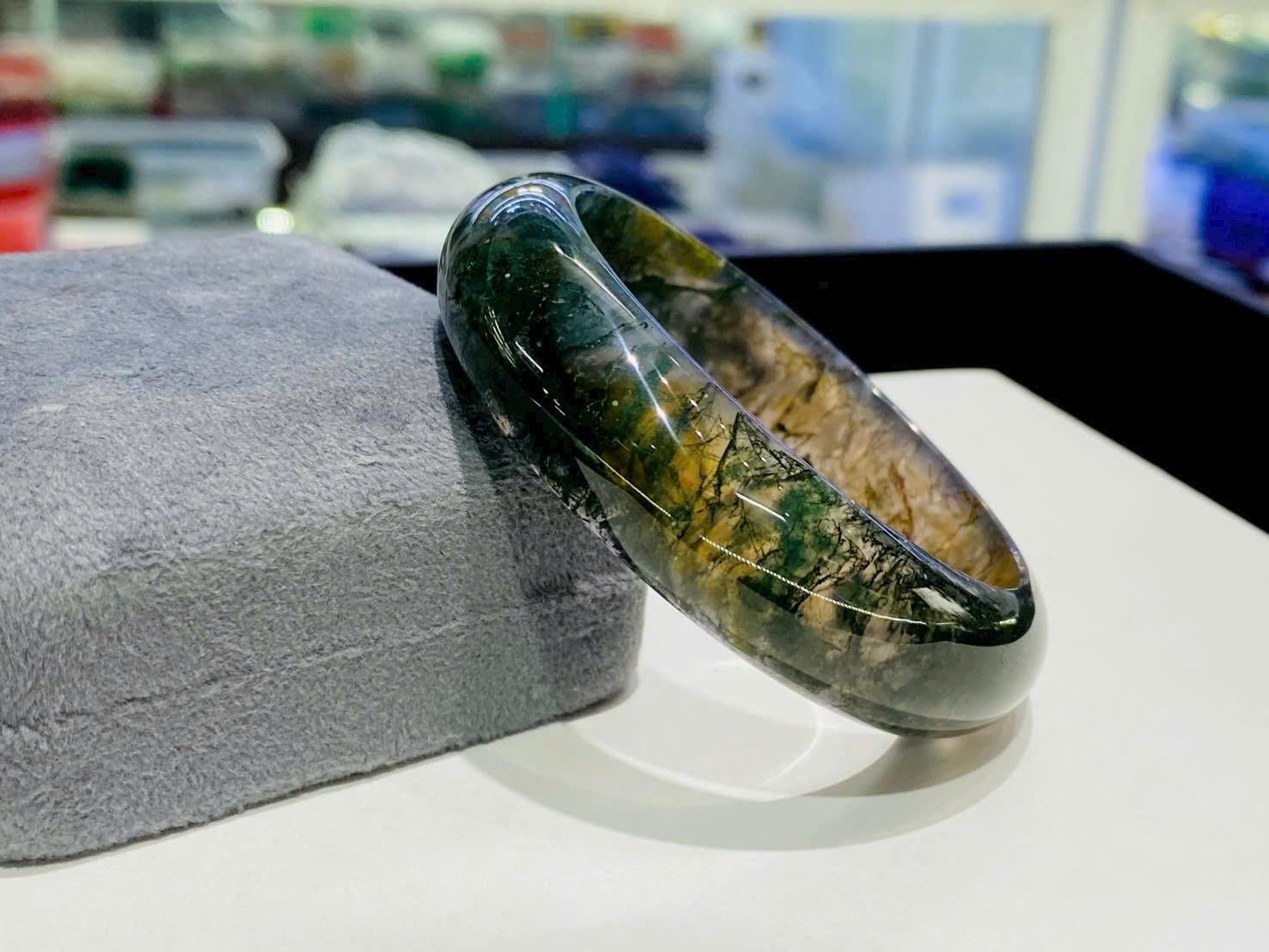 Ở mẫu vòng này, vân rêu hiện rõ, có chiều sâu, tạo cảm giác như đang nhìn vào một khu rừng rêu phong cổ kính hoặc một lớp địa tầng tự nhiên. Bề mặt vòng được mài bóng kỹ, ánh ngọc lên nước đẹp, càng đeo lâu càng trong và bóng hơn.