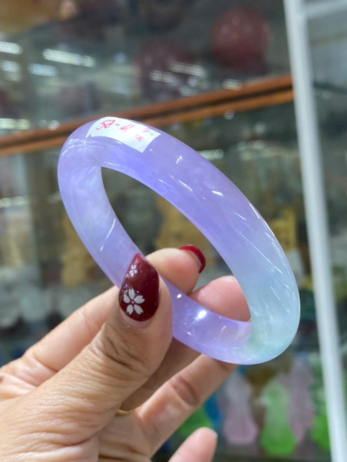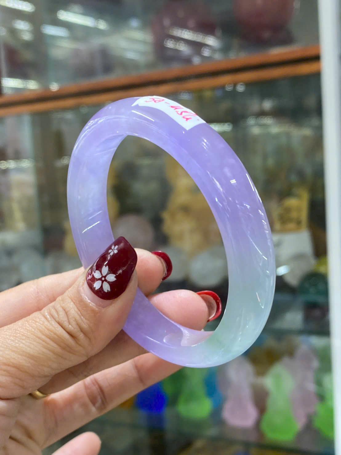 Vòng được chế tác từ ngọc cẩm thạch thiên nhiên, nổi bật với gam tím phớt lý dịu nhẹ, trong mát và có độ bóng cao. Màu tím phớt không quá đậm, mang lại cảm giác thanh khiết, mềm mại, vừa sang trọng vừa trẻ trung. Dưới ánh sáng, bề mặt vòng ánh lên hiệu ứng trong suốt nhẹ, tạo chiều sâu và sức hút tự nhiên.