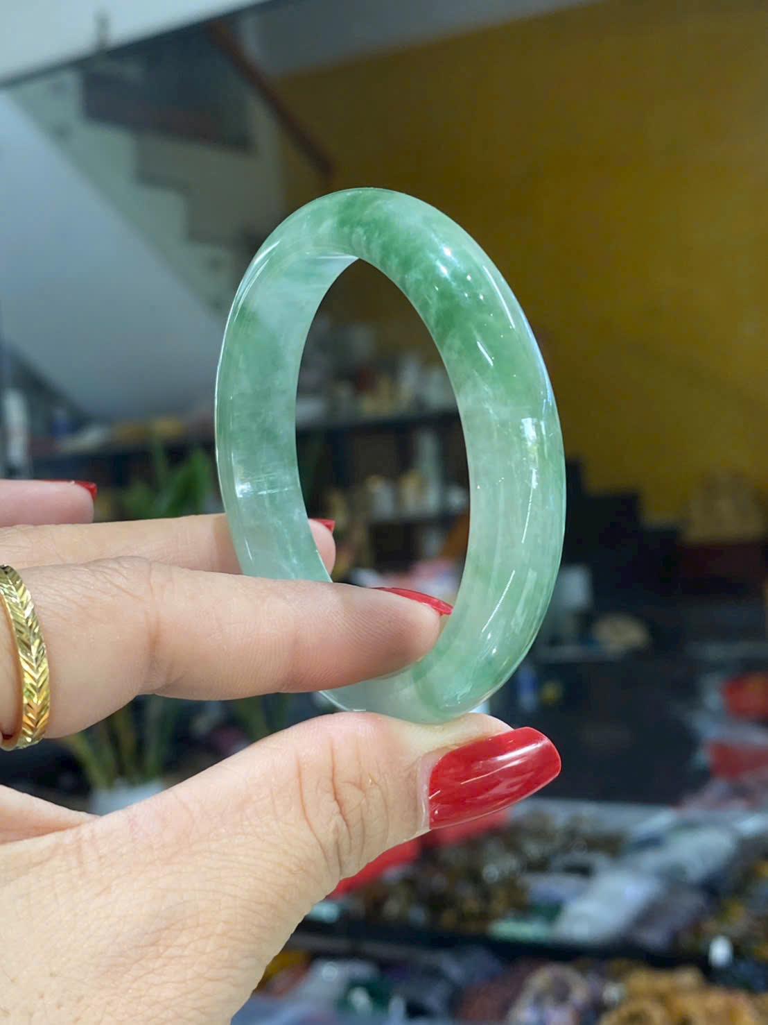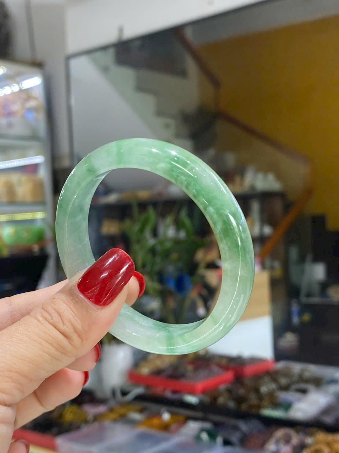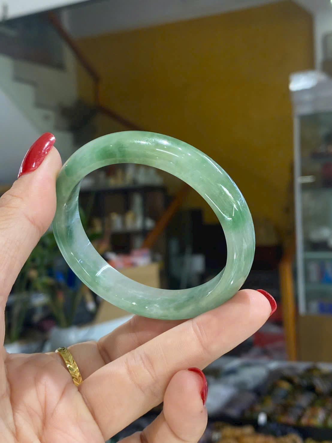 Vòng sở hữu tông xanh ngọc nhạt pha sữa đặc trưng của cẩm thạch, màu lên đều, dịu và rất mát mắt. Sắc xanh không quá đậm, không quá nhạt, tạo cảm giác trong trẻo, thanh khiết và dễ chịu khi nhìn lâu. Trên nền ngọc có những dải vân mờ nhẹ như làn khói, chạy mềm mại theo thân vòng, làm tăng chiều sâu và nét tự nhiên cho sản phẩm.