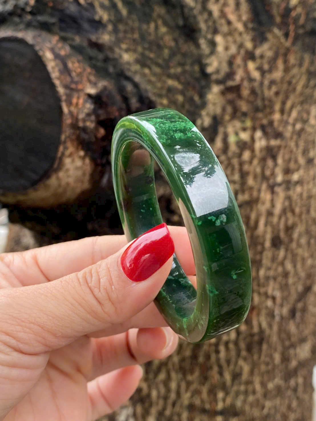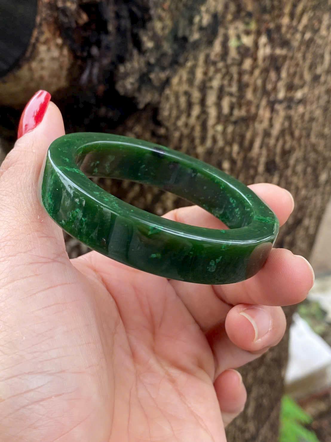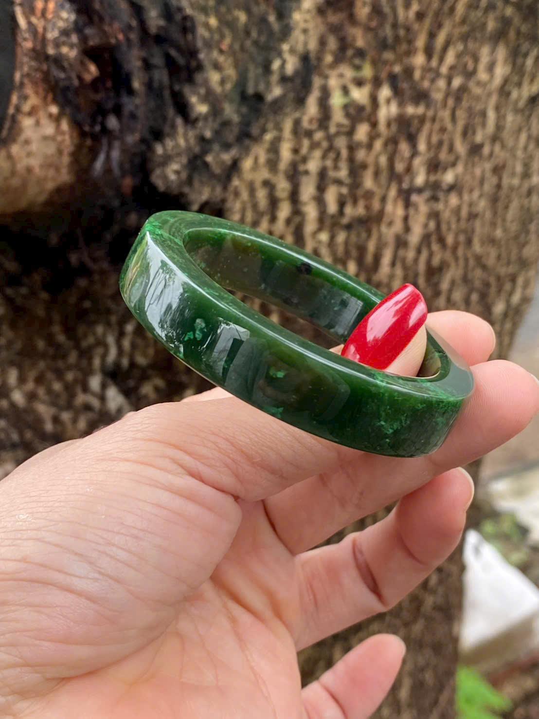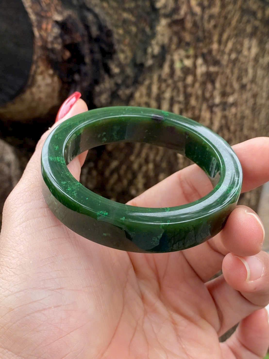 Điểm đặc biệt của sản phẩm nằm ở màu xanh rêu chuyển xanh đậm tự nhiên, kết hợp cùng hiệu ứng hơi ánh mờ khi gặp ánh sáng. Bề mặt vòng sau khi được đánh bóng trở nên láng mịn, tạo cảm giác mát tay khi chạm vào. Nhìn gần, người chơi dễ dàng thấy các lớp vân đá tự nhiên chạy dọc theo thân vòng, thể hiện giá trị của ngọc nguyên khối thật – điều mà vật liệu nhân tạo không thể mô phỏng.