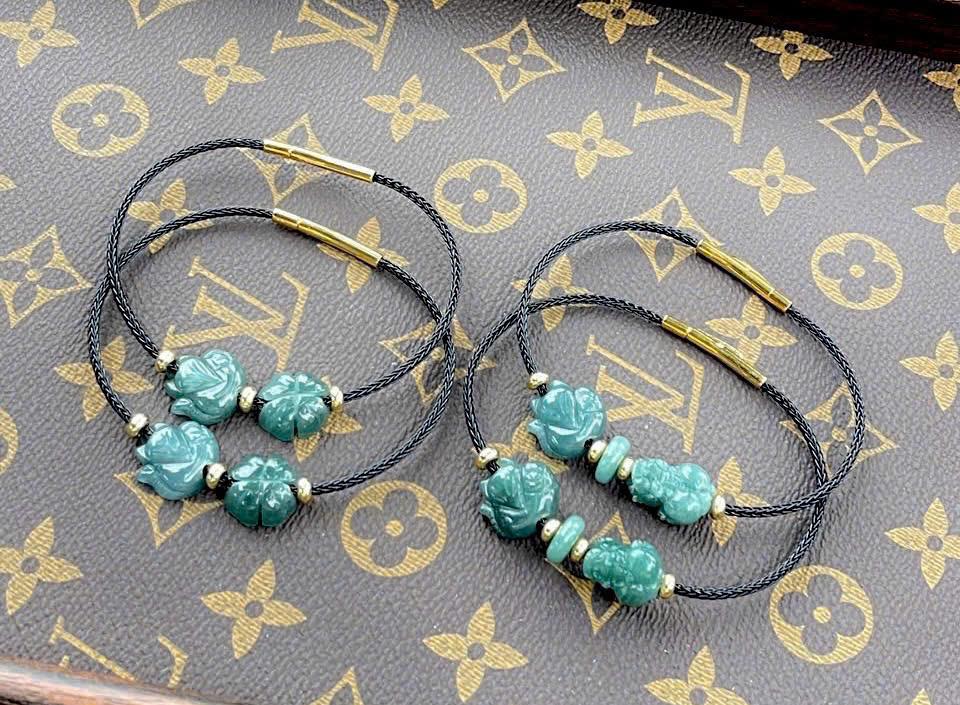Điểm nhấn trung tâm của vòng là hồ ly và cỏ bốn lá được chạm khắc từ lam ngọc xanh, sắc ngọc trong trẻo, ánh xanh dịu mắt, mang cảm giác mát lành và dễ chịu khi đeo. Lam ngọc từ lâu đã được xem là loại đá tượng trưng cho sự bình an, trí tuệ và năng lượng tích cực, rất phù hợp với người thường xuyên làm việc, giao tiếp hoặc mong cầu sự ổn định trong cảm xúc và các mối quan hệ.