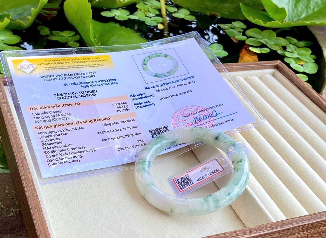 Dưới ánh sáng tự nhiên, nền ngọc ánh lên độ trong nhẹ, các vân xanh trở nên rõ nét hơn, tạo chiều sâu rất đẹp. Khi di chuyển, vòng bắt sáng dịu, không chói nhưng đủ để tạo điểm nhấn tinh tế. Đây là kiểu vẻ đẹp không phô trương, nhưng lại rất “ăn mắt” với những ai yêu thích sự thanh lịch.