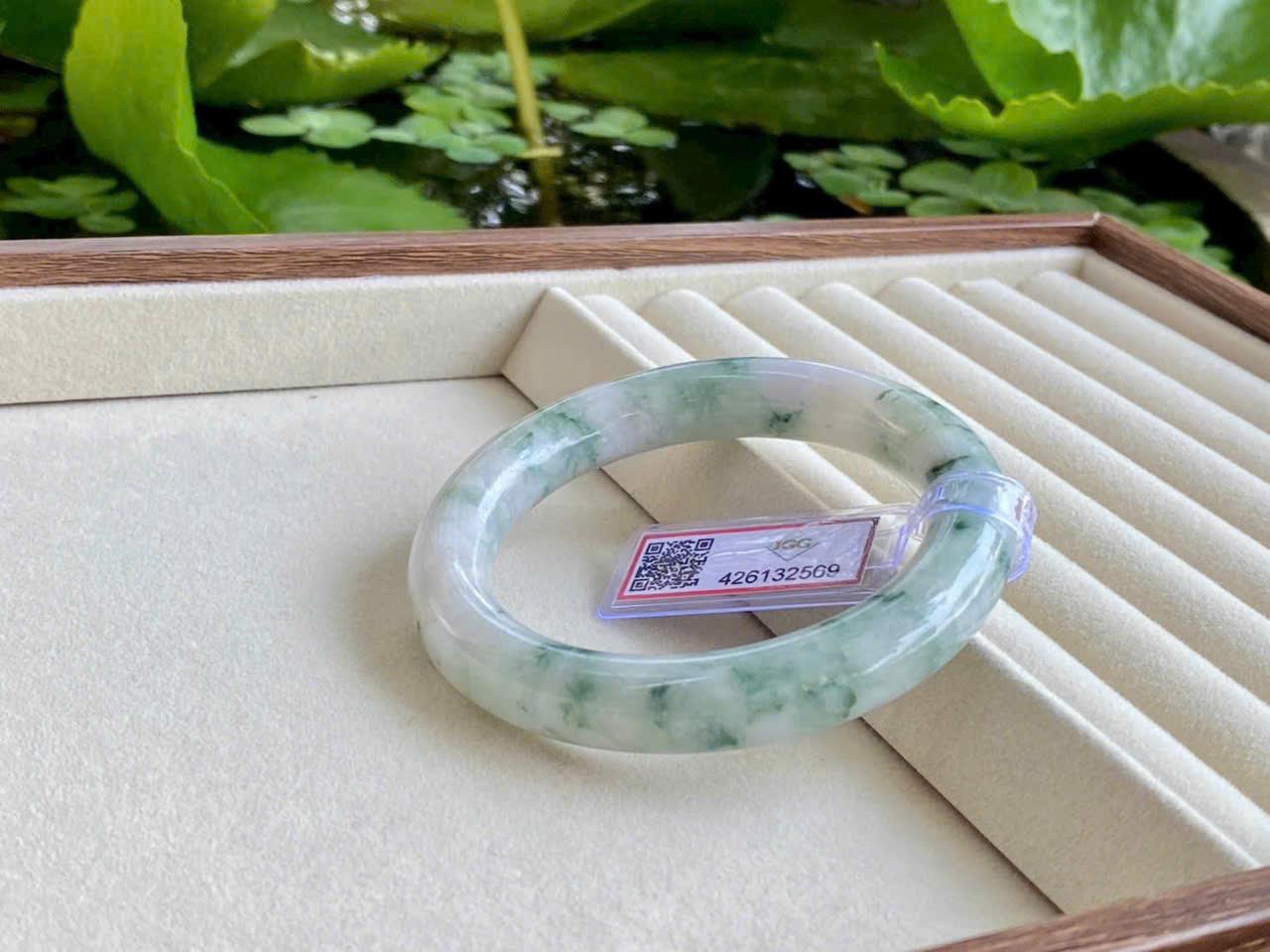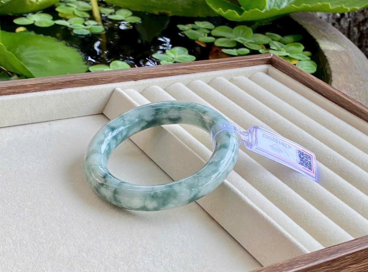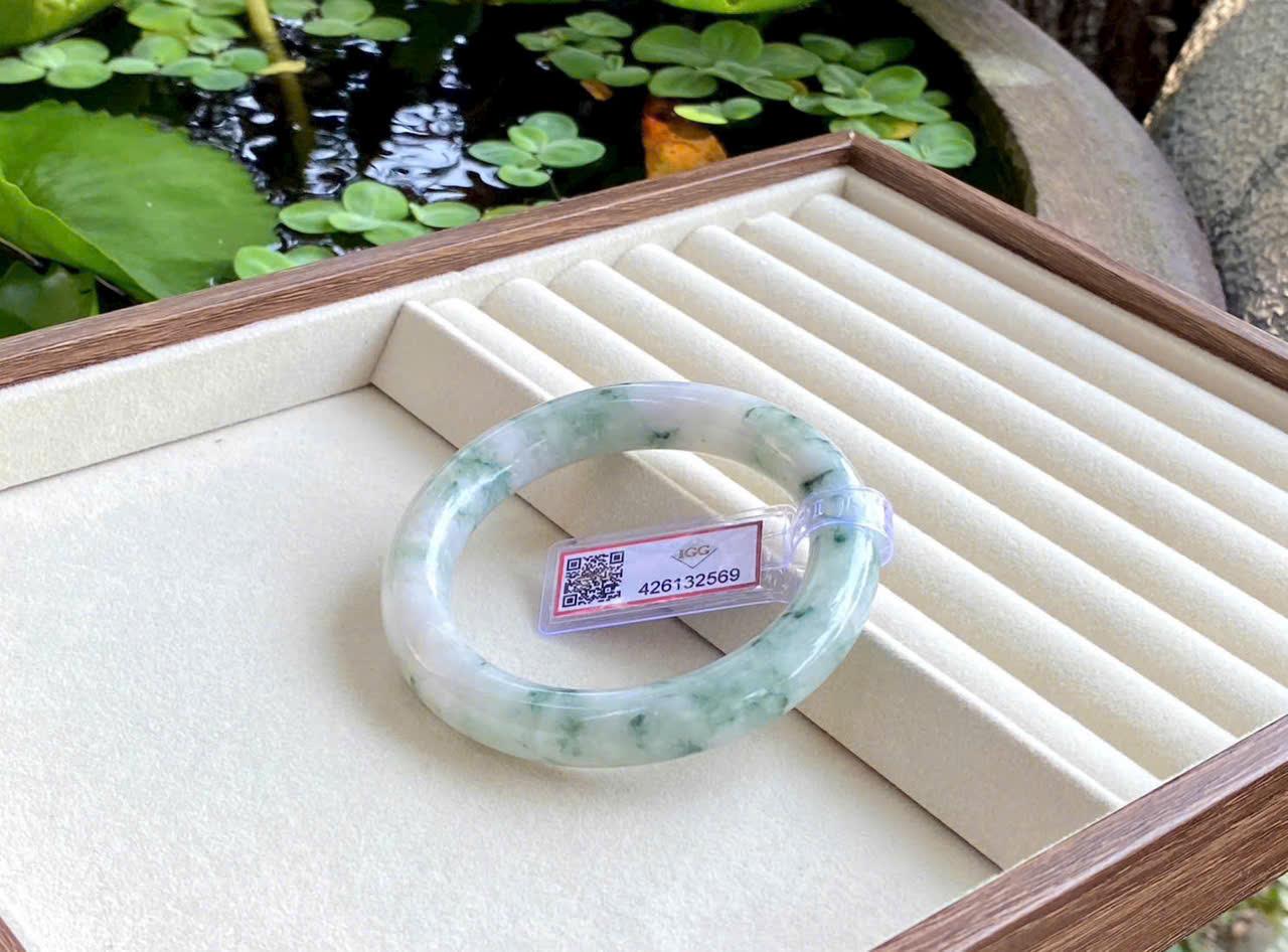Chiếc vòng gây ấn tượng bởi nền ngọc trắng xanh trong trẻo, điểm xuyết những vân xanh “hoa bay” tự nhiên, phân bố ngẫu nhiên đầy nghệ thuật. Không quá đậm, không quá nổi, chính sự loang nhẹ này lại tạo nên nét duyên rất riêng – càng nhìn càng thấy mềm mại và cuốn hút. Mỗi chiếc là một “bản thể” khác nhau, không trùng lặp, mang lại cảm giác độc bản cho người sở hữu, giúp bạn luôn cảm thấy chiếc vòng mình đeo là duy nhất.