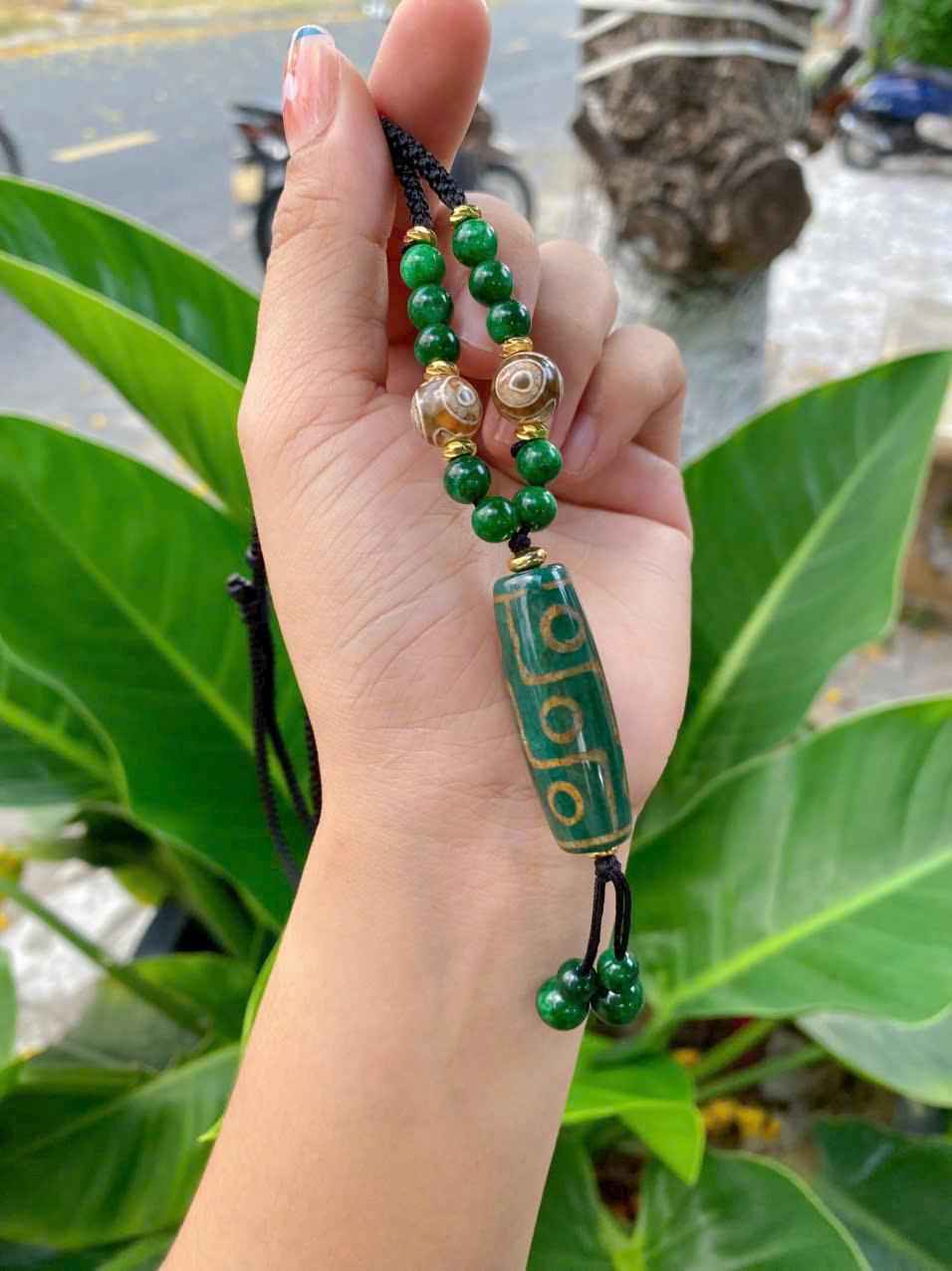 Hạt dzi 9 mắt được coi là một trong những mẫu dzi quyền năng nhất trong phong thủy Tây Tạng. Khi kết hợp cùng thân xanh ngọc, năng lượng của hạt dzi càng trở nên mạnh mẽ: