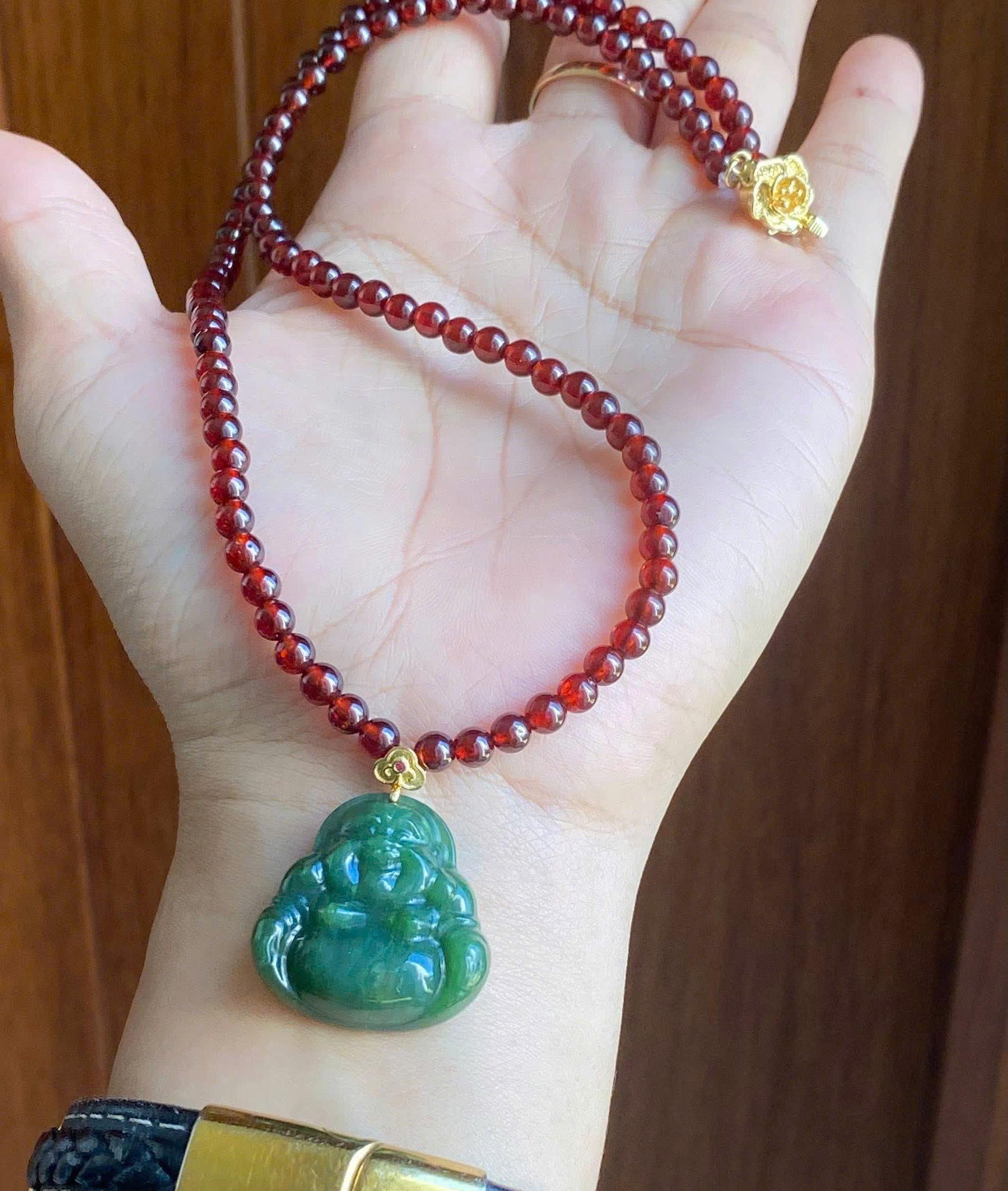 Vòng cổ mặt Di Lặc ngọc bích + chuỗi Garnet ngọc hồng lựu – Kết tinh phúc lộc, tài vận và bình an