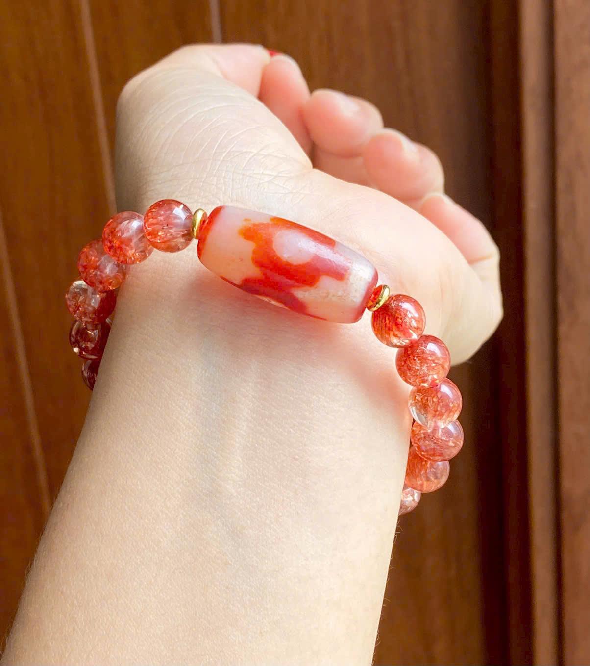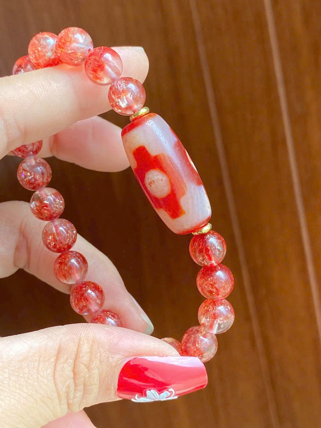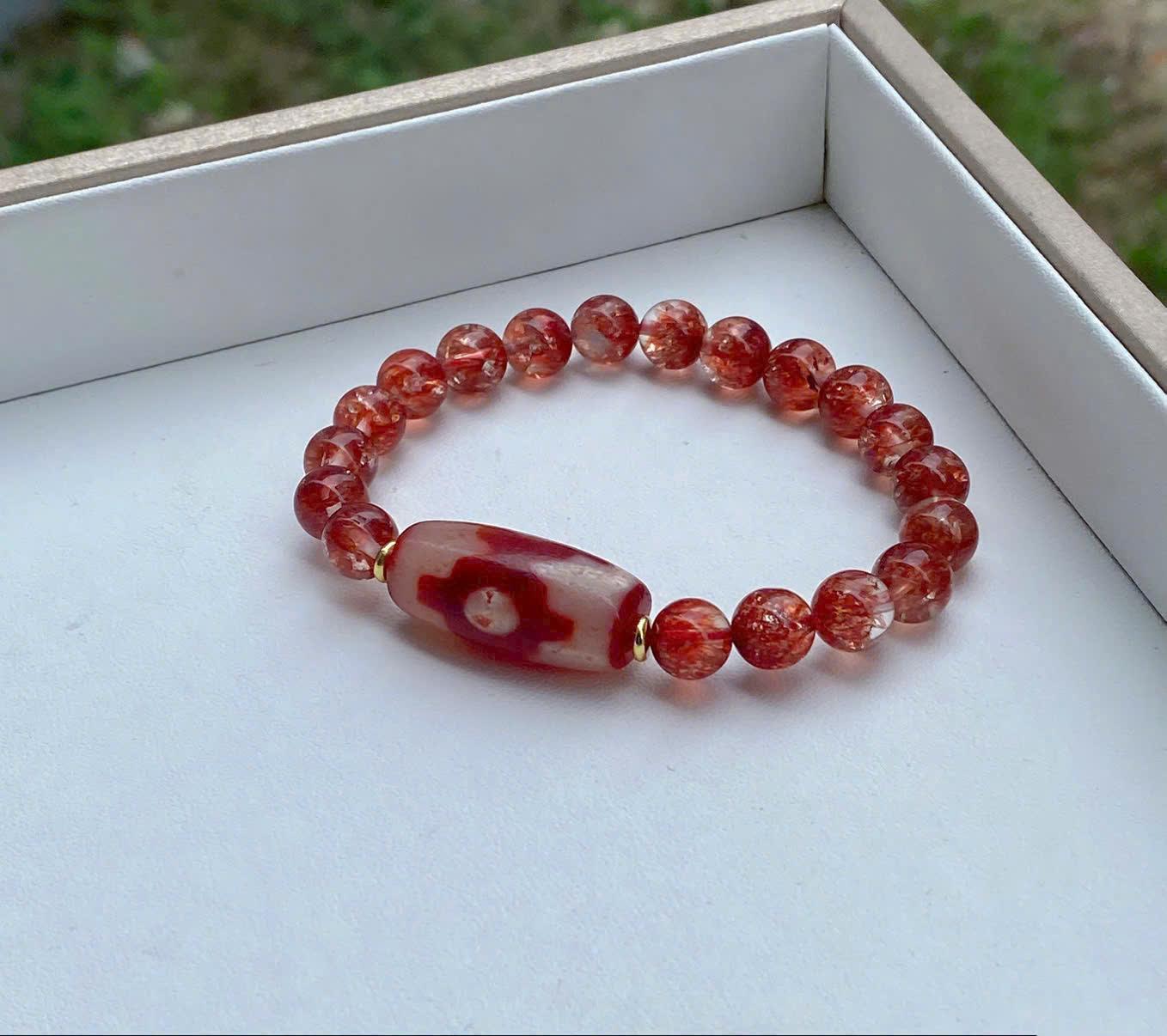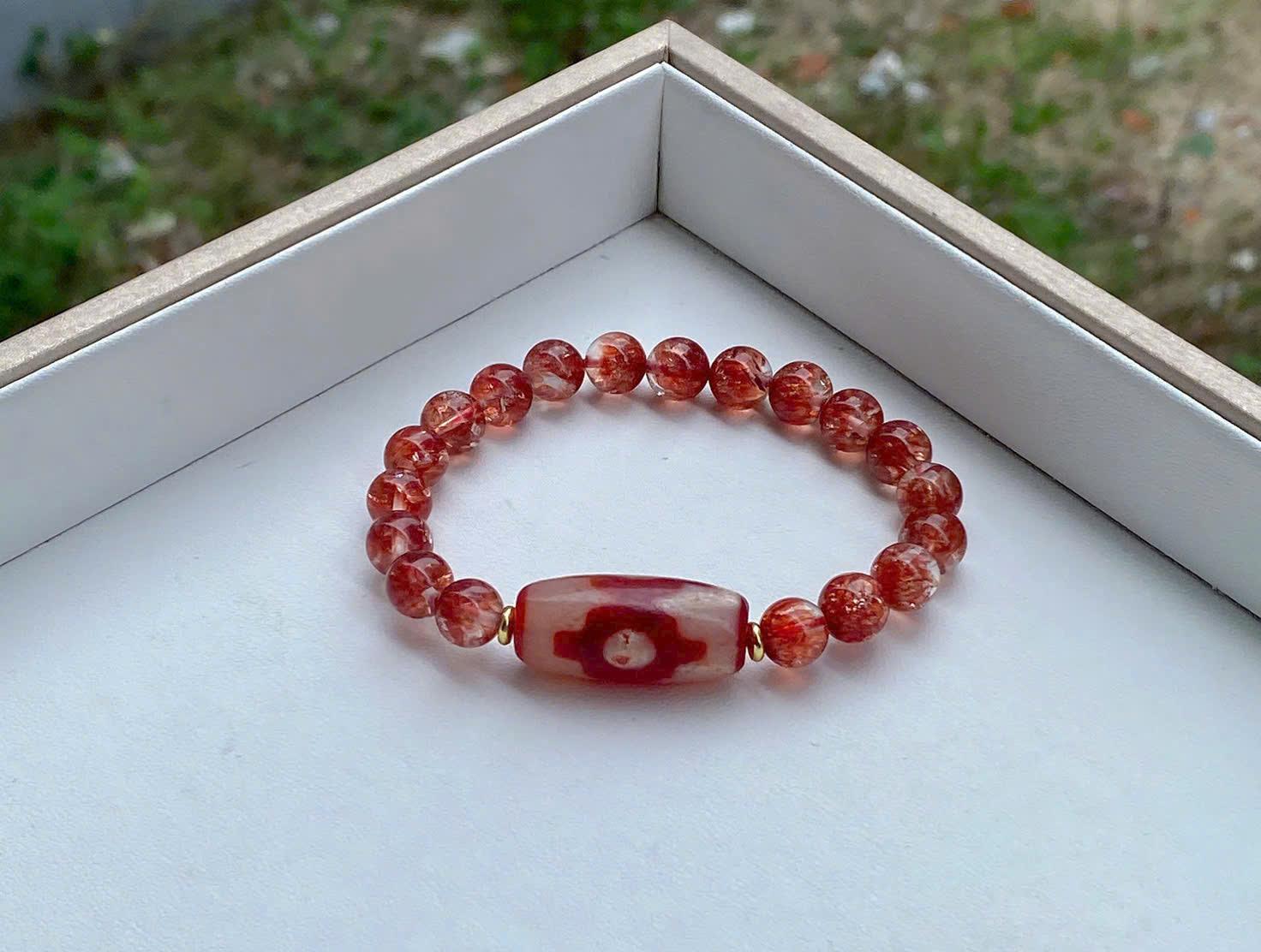Sự hòa quyện giữa Dzi 3 mắt linh thiêng và Thạch Anh Ưu Linh Đỏ quyền năng tạo nên chiếc vòng vừa mang tính thẩm mỹ cao, vừa là vật phẩm phong thủy hội tụ đủ may mắn – tài lộc – tình duyên – sức khỏe.
