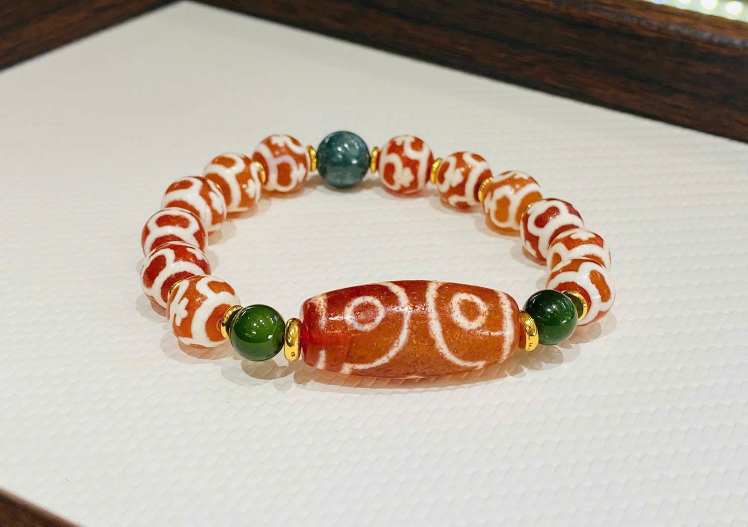 Vòng được phối từ chuỗi hạt Dzi tròn họa tiết cổ, kết hợp xen kẽ các hạt đá xanh lục và xanh rêu, tạo điểm nhấn tinh tế và cân bằng màu sắc. Các chi tiết kim loại mạ vàng nhỏ giúp tổng thể thêm phần sang trọng, tăng tính thẩm mỹ mà không làm mất đi vẻ cổ điển vốn có của dòng Dzi Tây Tạng.