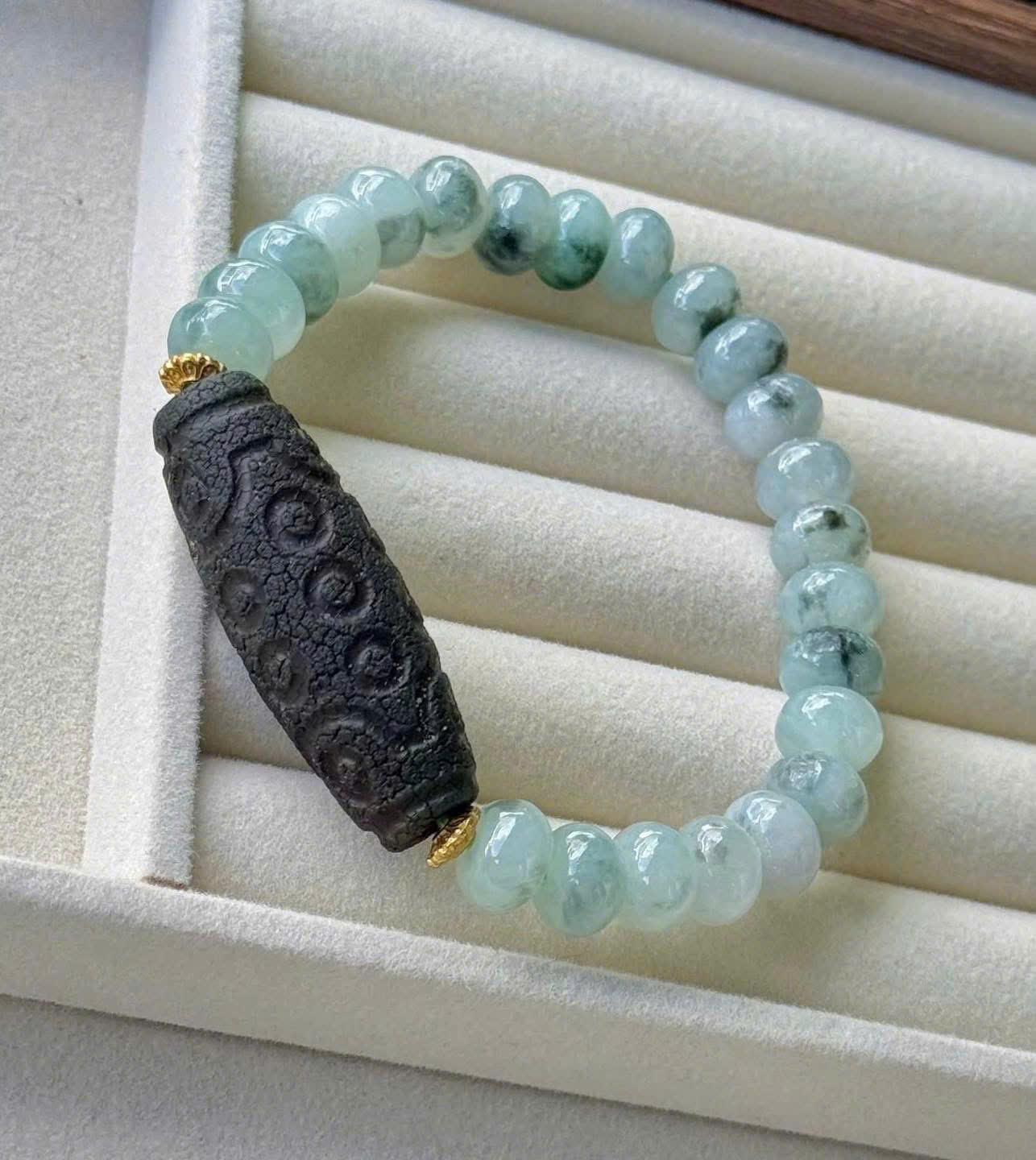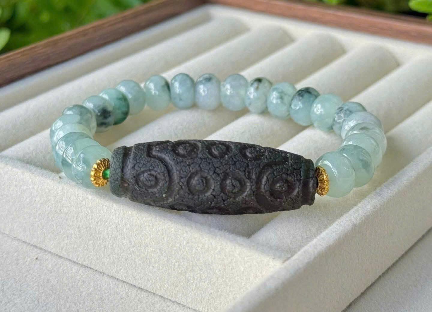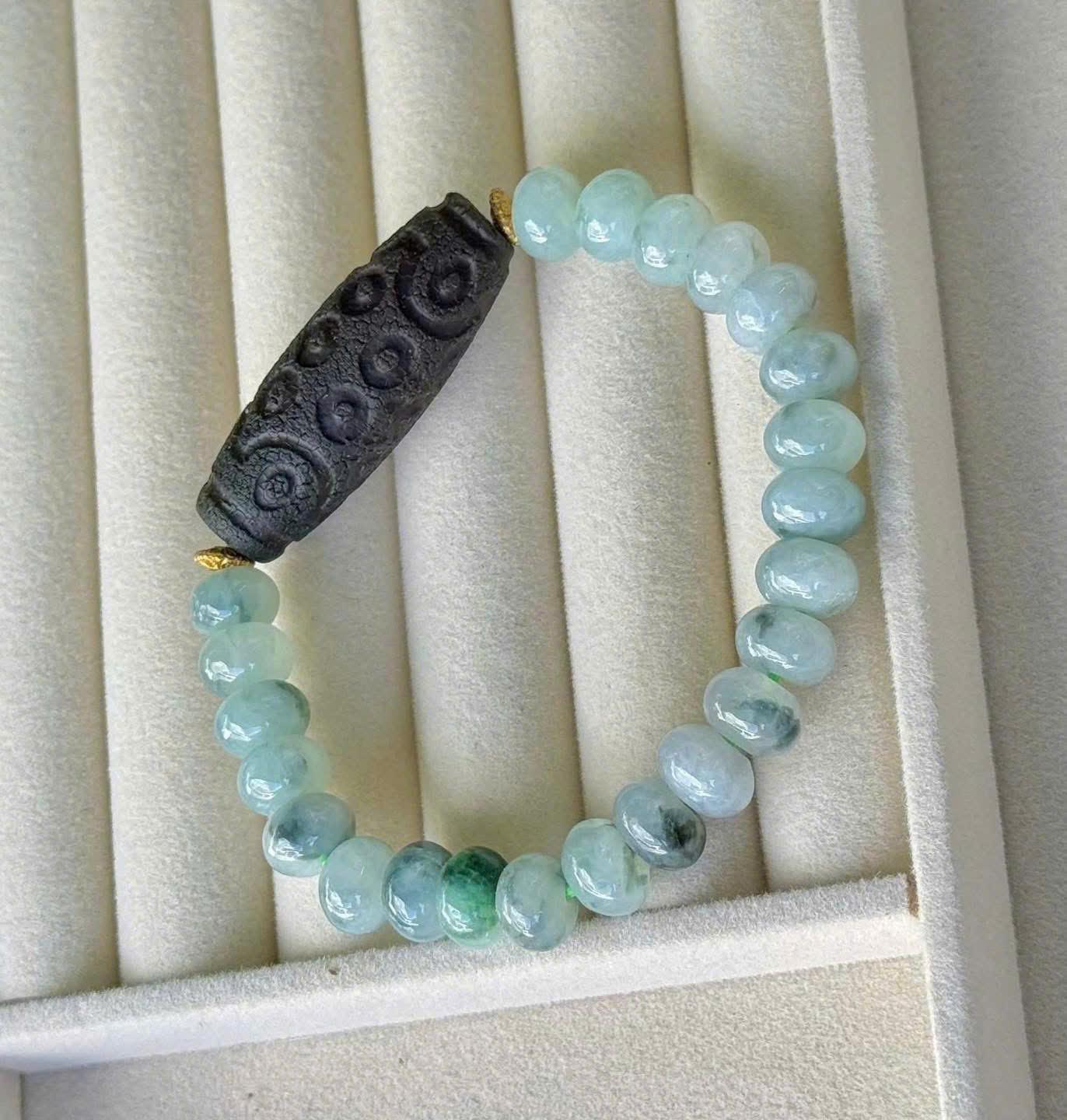 Vòng có thiết kế gọn gàng, tinh tế, phù hợp cho cả nam và nữ. Tông màu xanh ngọc kết hợp cùng sắc trầm cổ của Dzi tạo nên vẻ đẹp sang trọng, trầm ổn nhưng không kém phần cuốn hút.