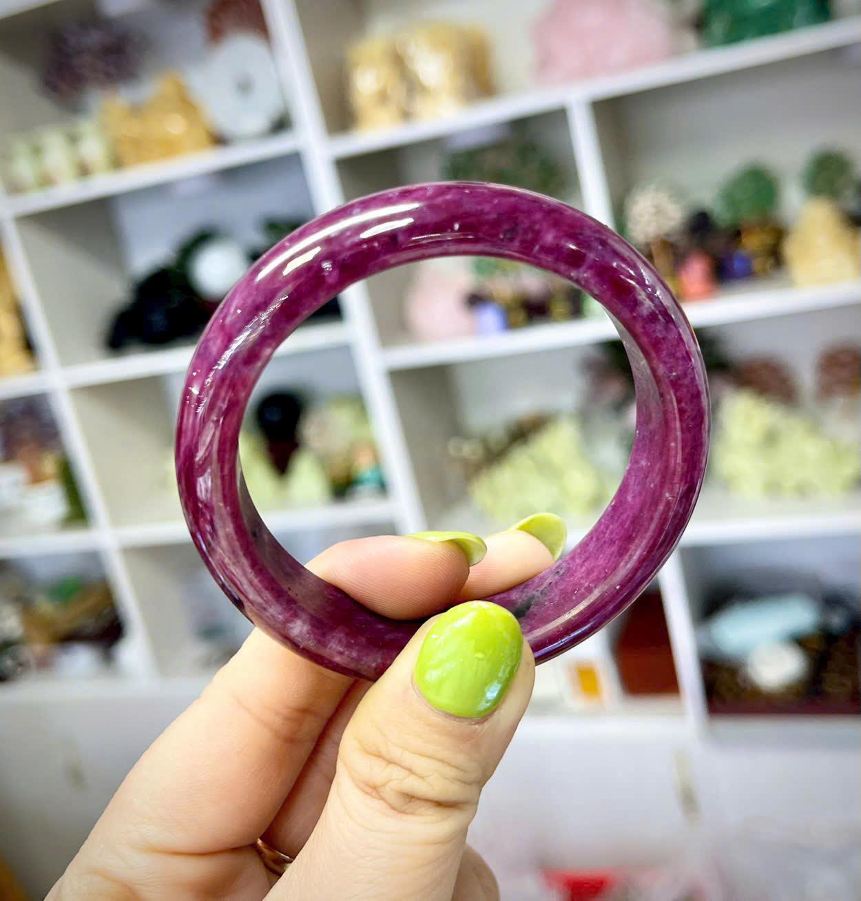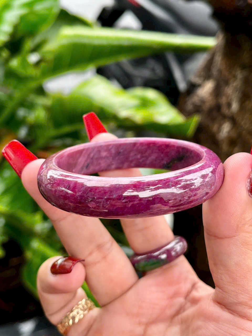 Chiếc vòng có bản rộng 13,5mm, được chế tác từ khối ruby tự nhiên liền khối, mang đến cảm giác chắc tay và mạnh mẽ khi đeo. Kích thước ni 54 phù hợp với người có cổ tay trung bình, giúp ôm vừa vặn mà vẫn tôn dáng thanh thoát.