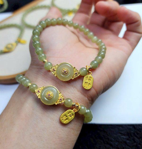 Vòng tay được chế tác từ ngọc Hòa Điền thiên nhiên cao cấp, nổi bật với độ bền và vẻ đẹp sang trọng. Chất ngọc có màu sắc tươi sáng, thuần khiết, mang đến cảm giác thanh lịch và trang nhã cho người đeo.