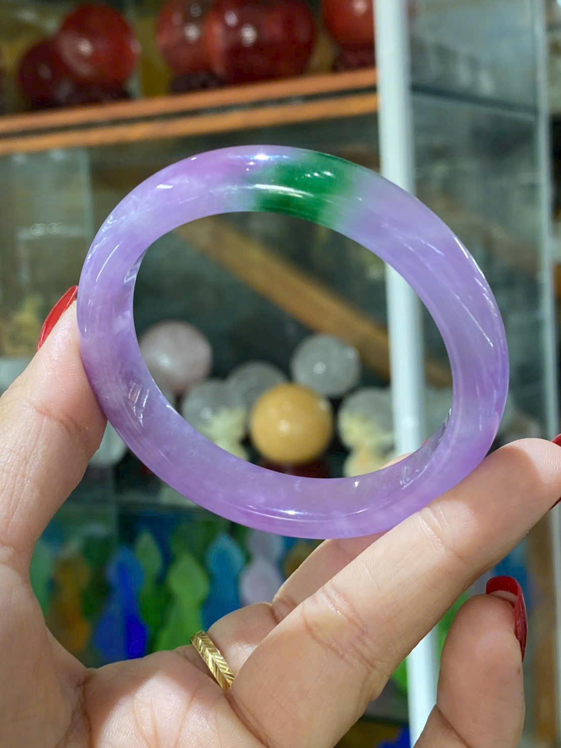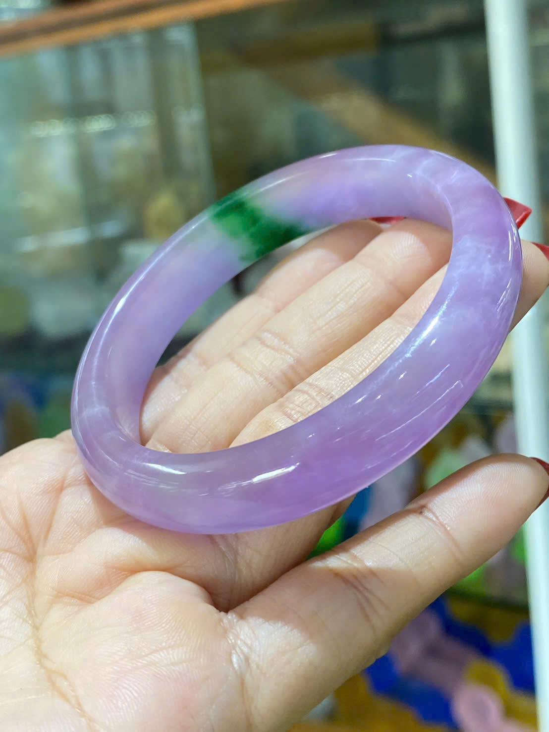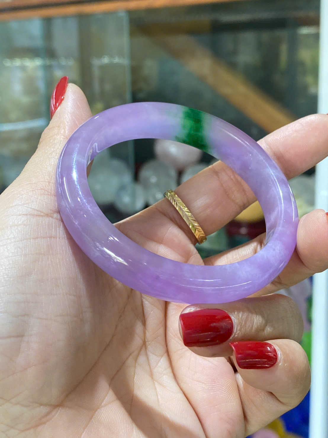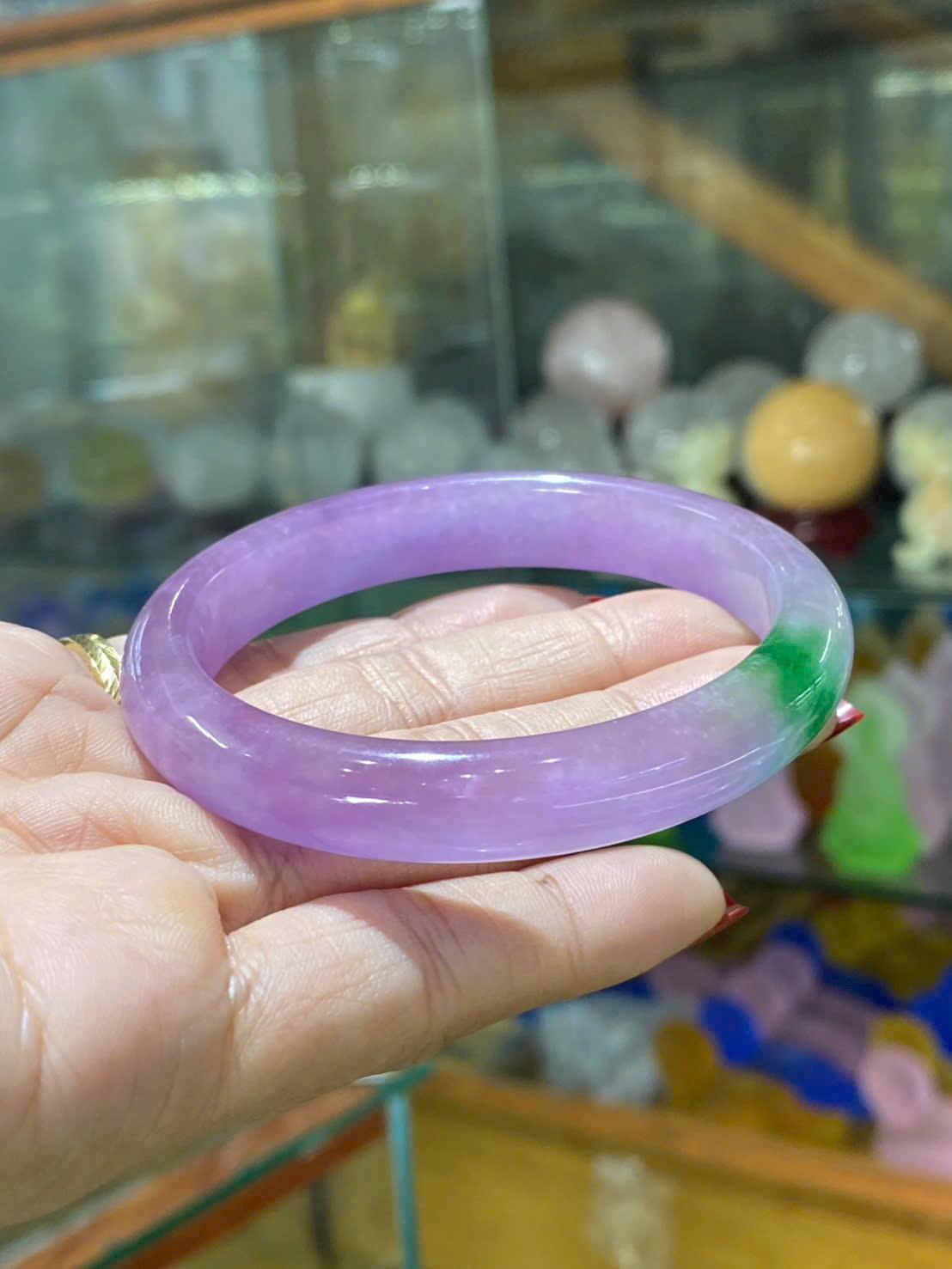 Cẩm thạch tím phớt lý là dòng cẩm thạch có màu tím nhạt pha hồng, sắc độ nhẹ và trong, mang lại cảm giác dịu dàng, thanh tao. Khác với những gam màu đậm, tím phớt lý được đánh giá cao bởi sự tinh khiết, dễ đeo và phù hợp với nhiều tông da khác nhau. Đặc biệt, trên thân vòng xuất hiện mảng xanh lục tự nhiên, tạo điểm nhấn độc đáo, giúp chiếc vòng trở nên sinh động và có hồn hơn.