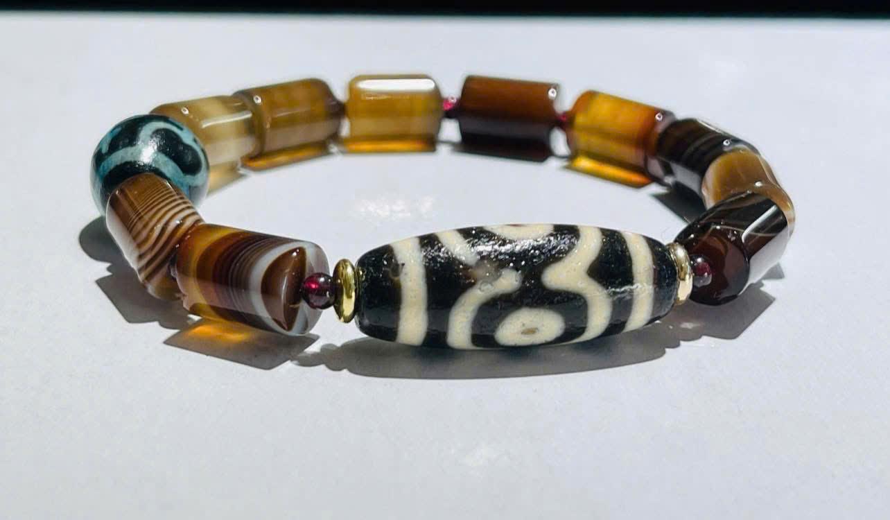 Thiết kế được phối cùng các hạt đá tự nhiên tông nâu, vàng hổ phách và sắc trầm cổ điển, tạo cảm giác sang trọng, cá tính nhưng vẫn giữ được nét huyền bí đặc trưng của dòng Dzi Tây Tạng.