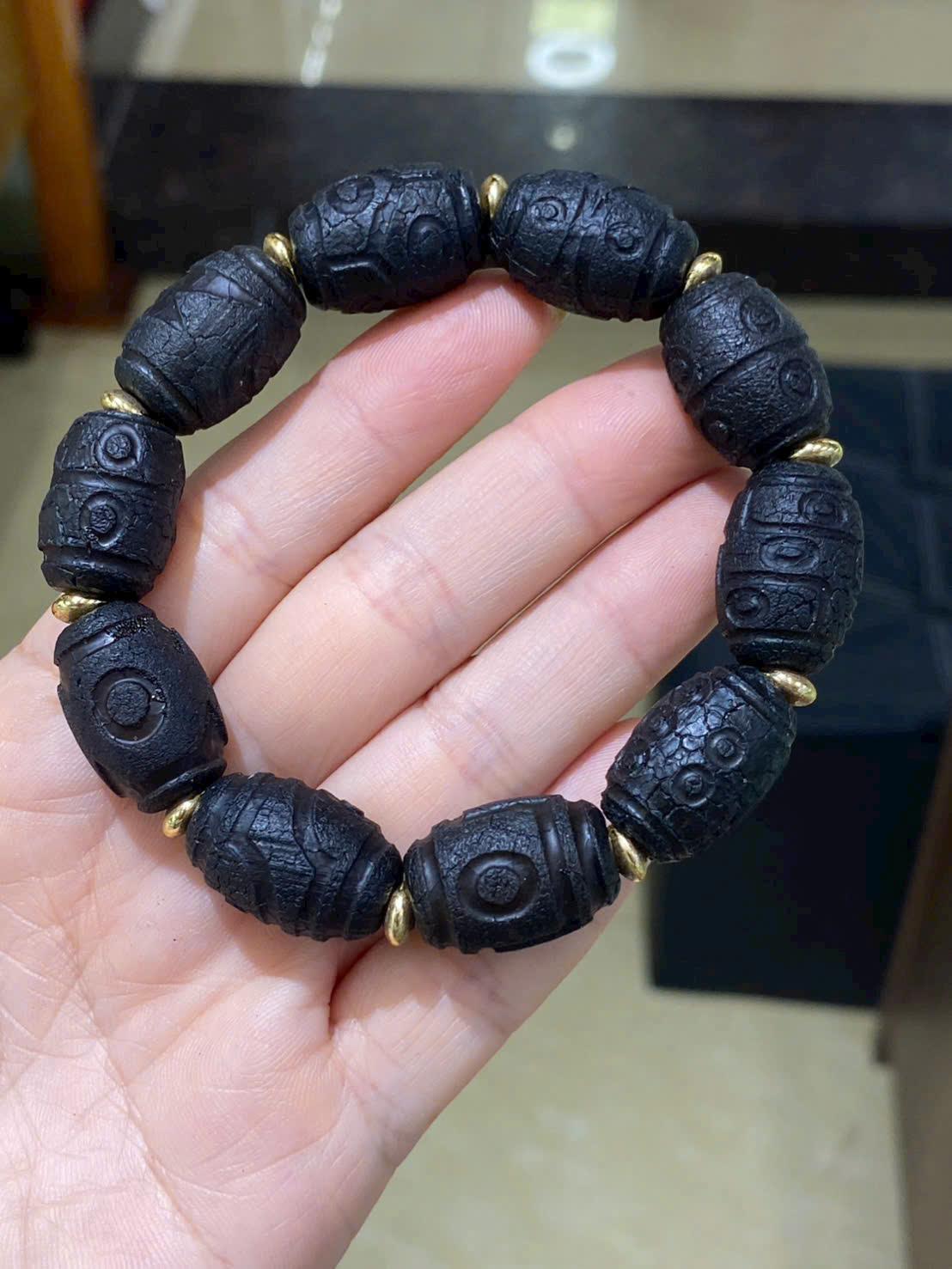 Vòng tay được chế tác từ các hạt Dzi cổ có màu đen trầm, bề mặt sần tự nhiên với hoa văn mắt rõ nét nhưng không đồng đều, thể hiện dấu ấn thời gian đặc trưng của Dzi cổ thật. Mỗi hạt đều mang nét riêng, không trùng lặp, tạo nên giá trị độc bản cho sản phẩm.