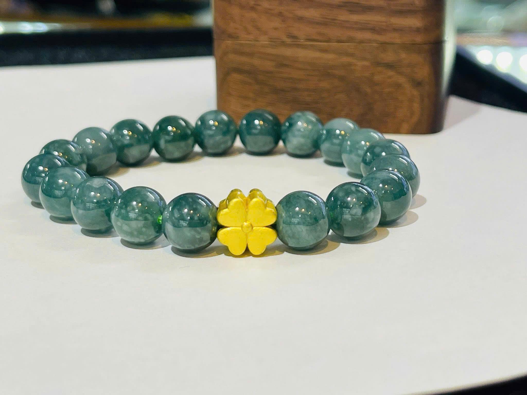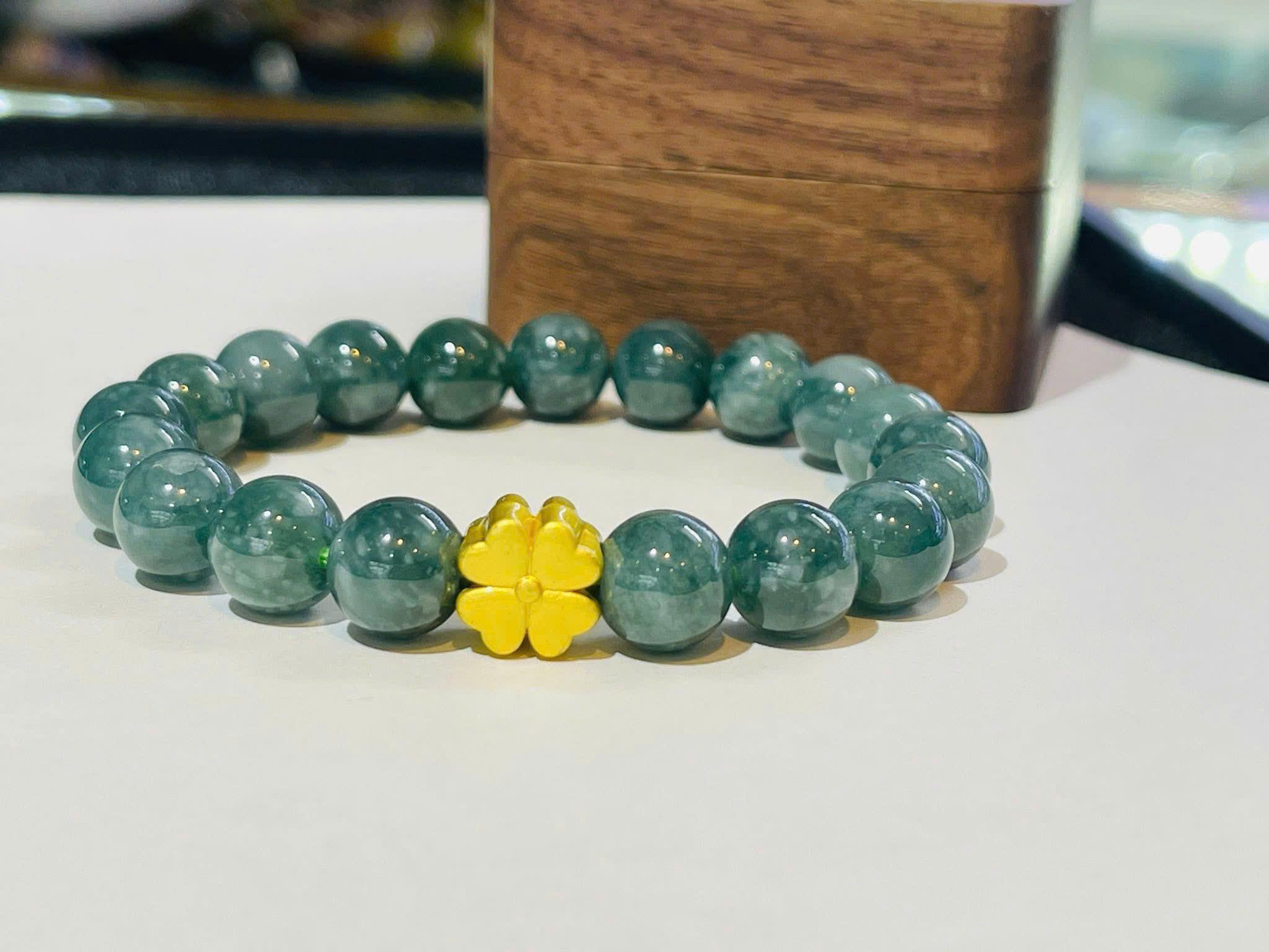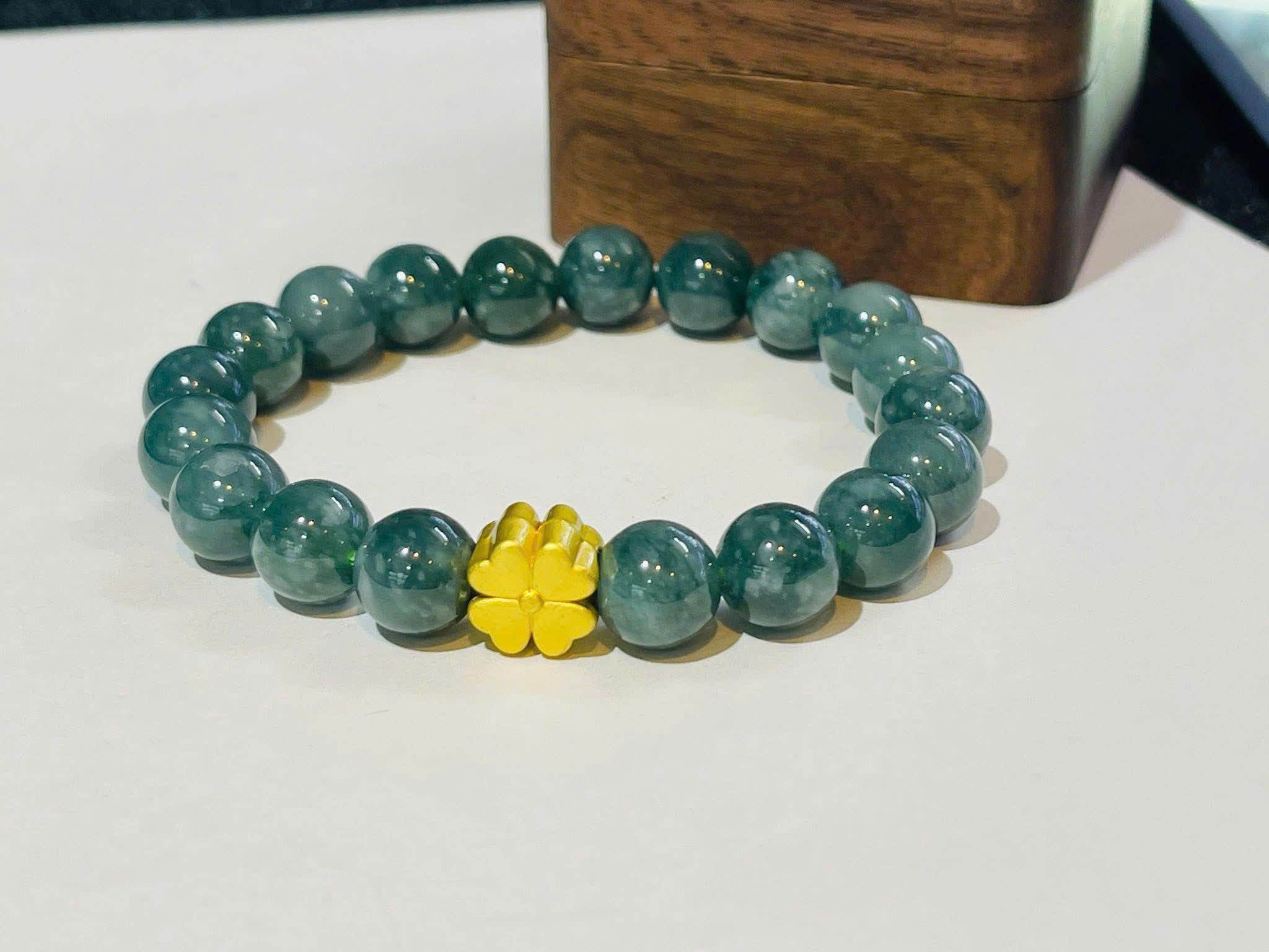 Vòng tay Lam Ngọc 10mm mix charm cỏ 4 lá mạ vàng si – Món trang sức mang năng lượng may mắn và bình an