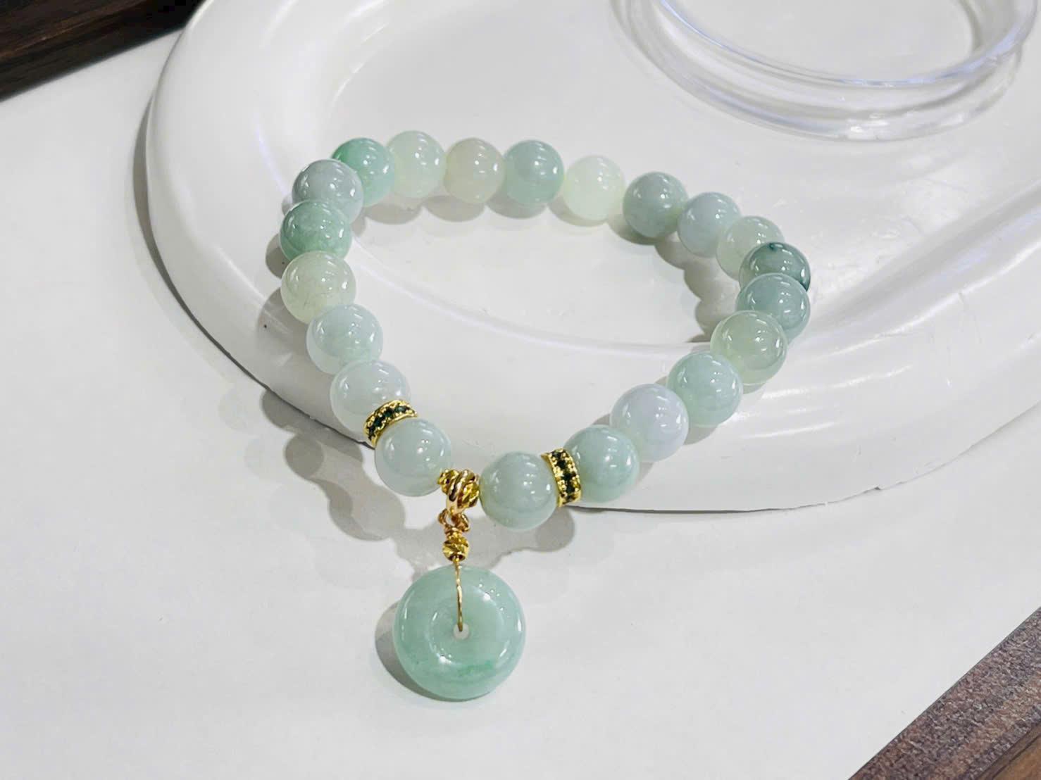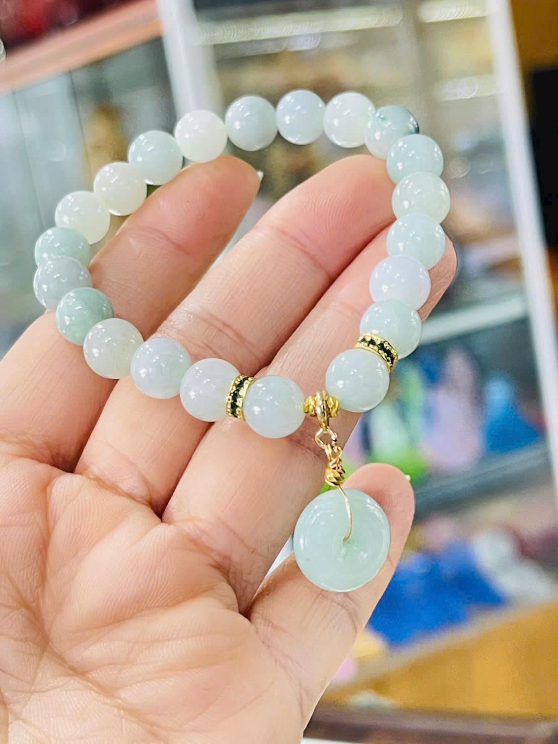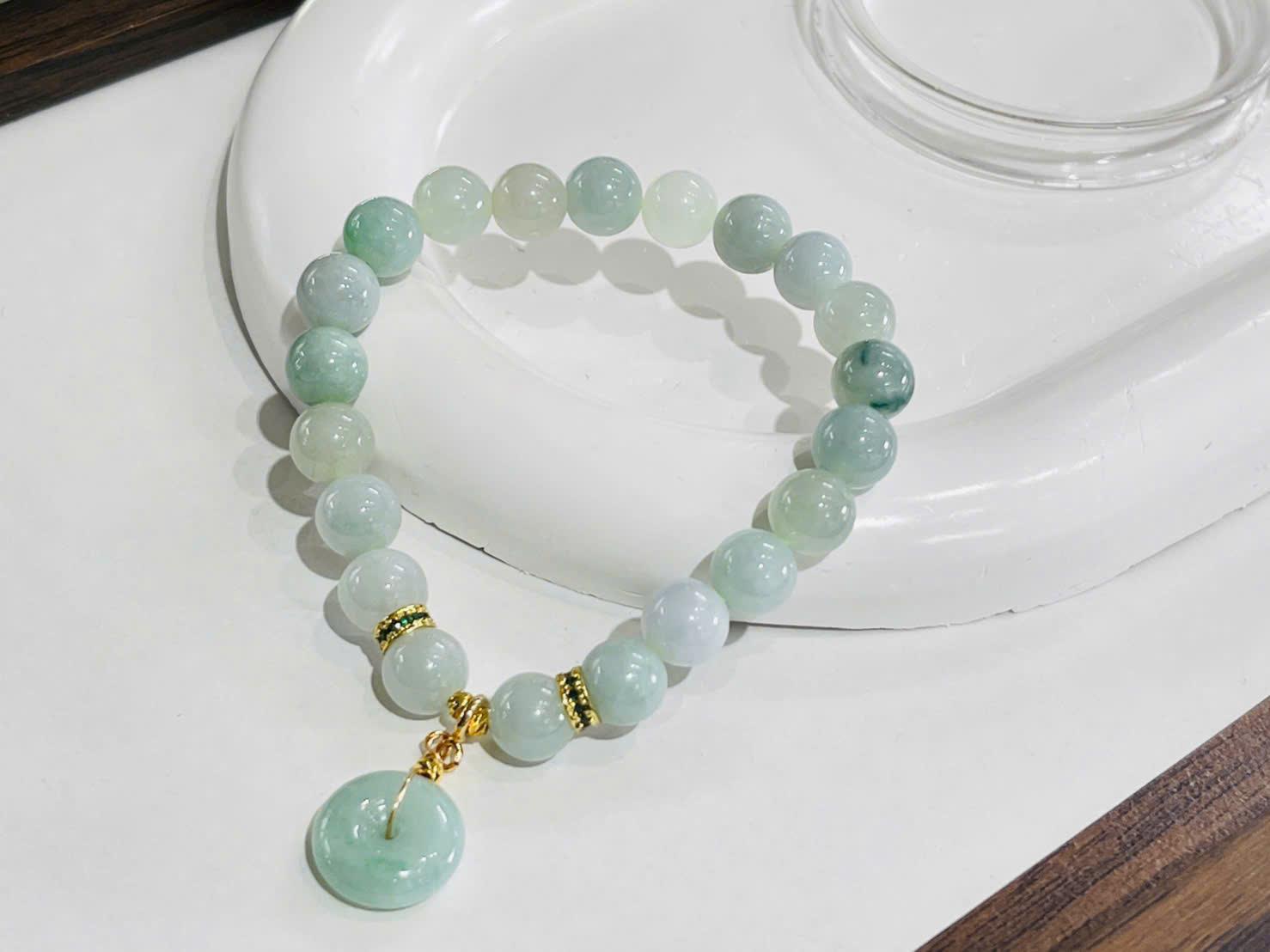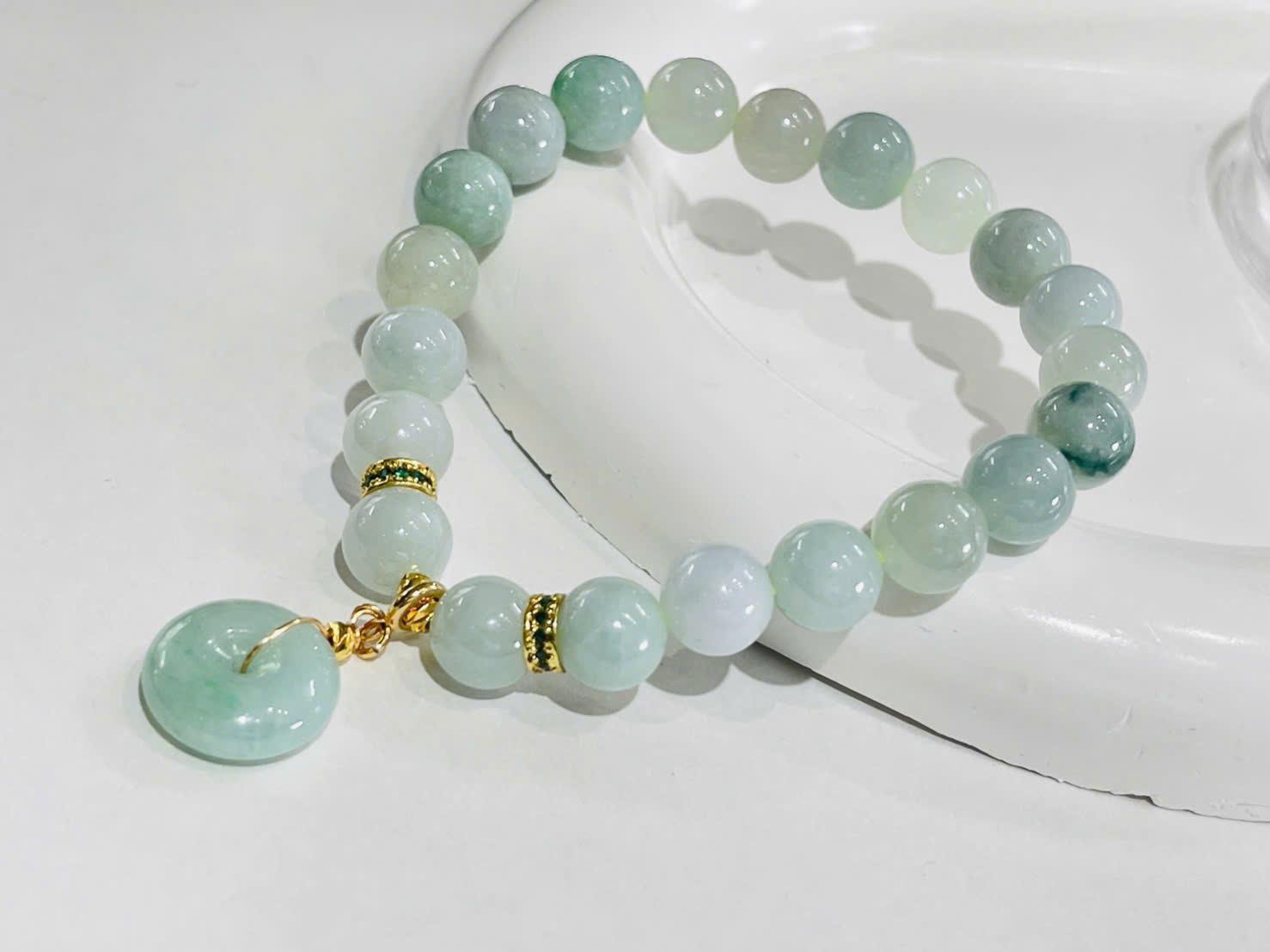 Vòng được chế tác từ ngọc Type A tự nhiên, loại ngọc được đánh giá cao nhất về độ tinh khiết và giá trị trong dòng ngọc jade. Các hạt ngọc sở hữu sắc xanh nhạt dịu mắt, ánh nước trong trẻo, bề mặt mịn và độ bóng tự nhiên, mang lại cảm giác mát tay và dễ chịu khi đeo.