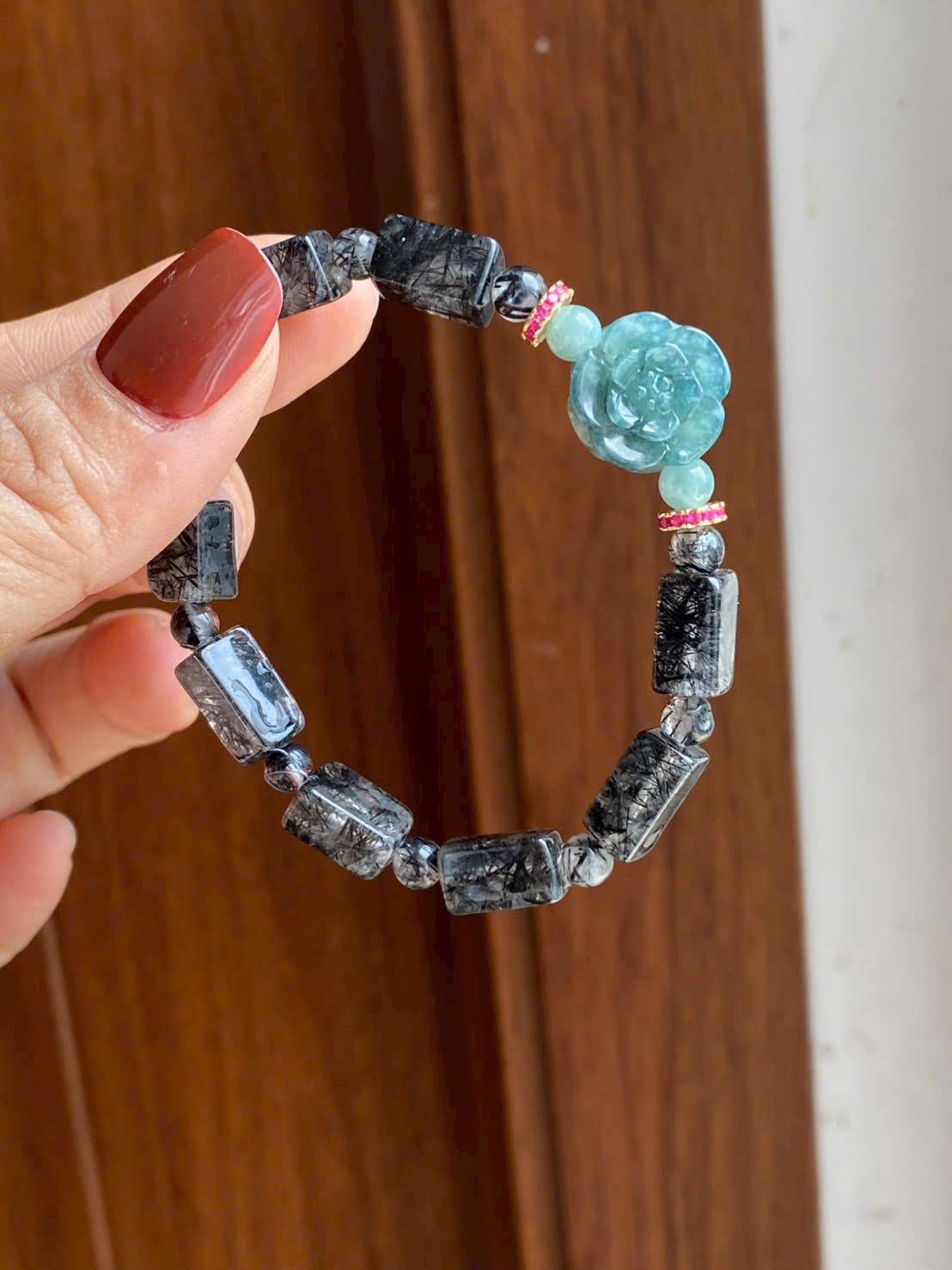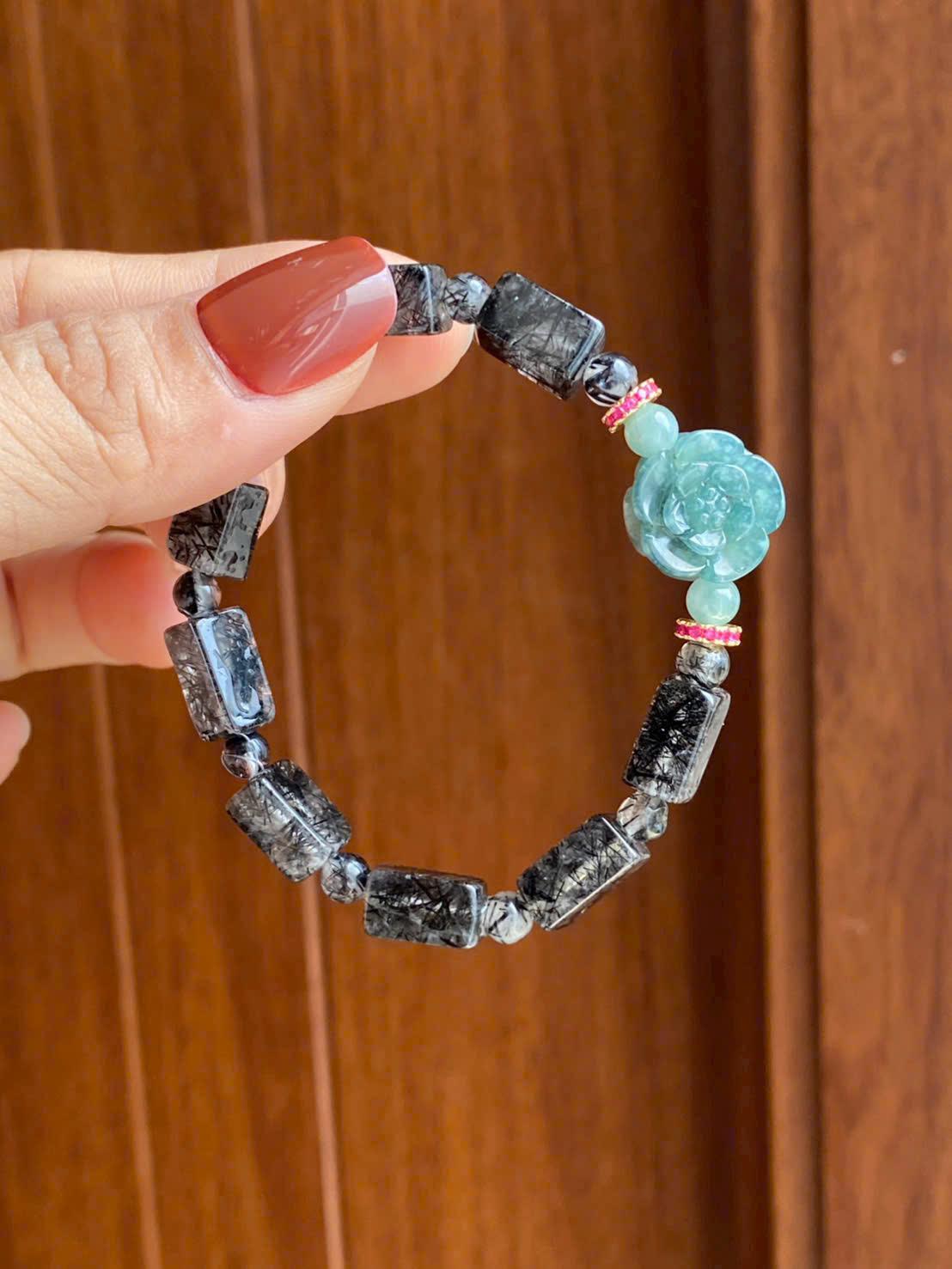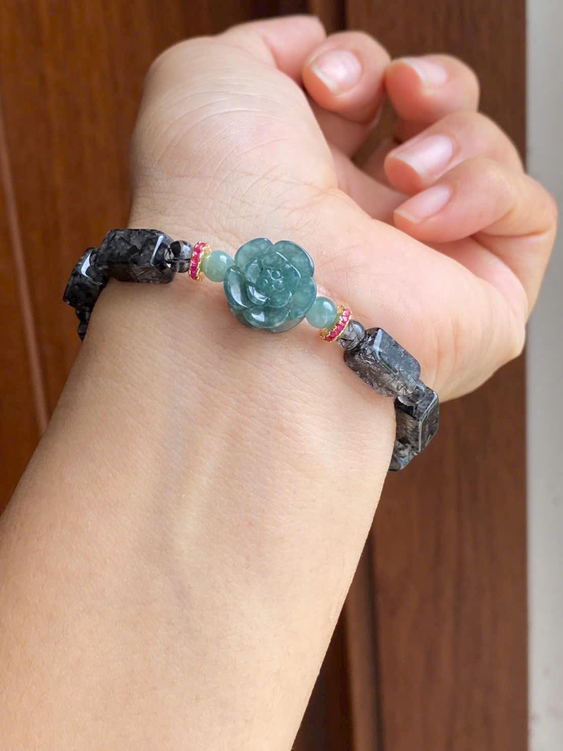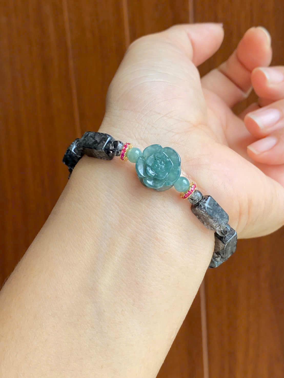 Vòng tay thạch anh tóc đen mix hoa mẫu đơn lam ngọc – sự kết hợp hoàn hảo