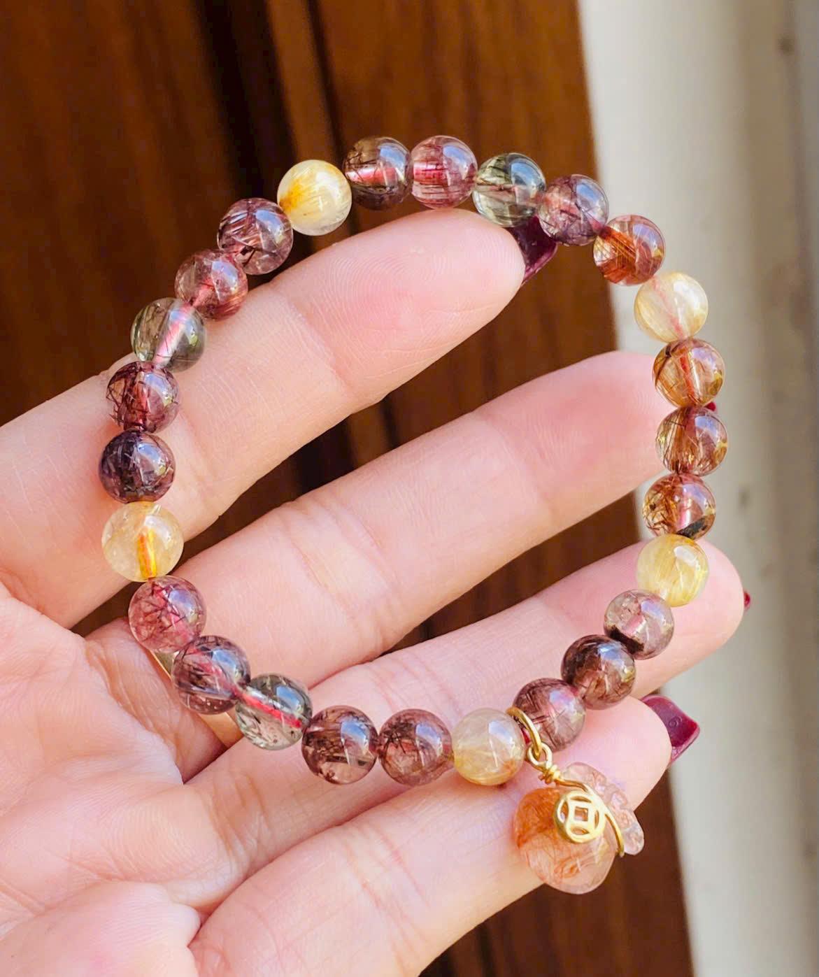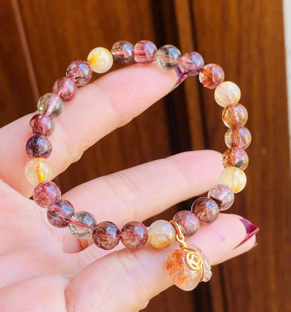 Nhìn tổng thể, chiếc vòng mang đến cảm giác hài hòa nhờ sự kết hợp của các gam màu tự nhiên như vàng, đỏ nâu và ánh xám nhẹ. Những sợi “tóc” bên trong mỗi viên đá tạo nên nét đẹp riêng biệt, khiến mỗi hạt đá đều có họa tiết khác nhau, không hạt nào giống hạt nào.