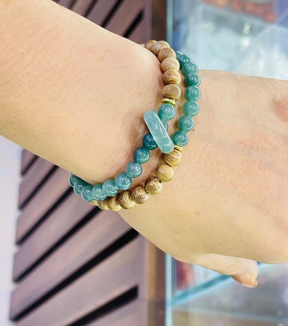 Chất đá mang lại cảm giác mát tay khi đeo, giúp tổng thể chiếc vòng trở nên thanh thoát hơn, không bị nặng nề như các mẫu vòng trầm thuần.