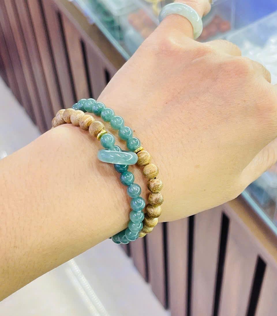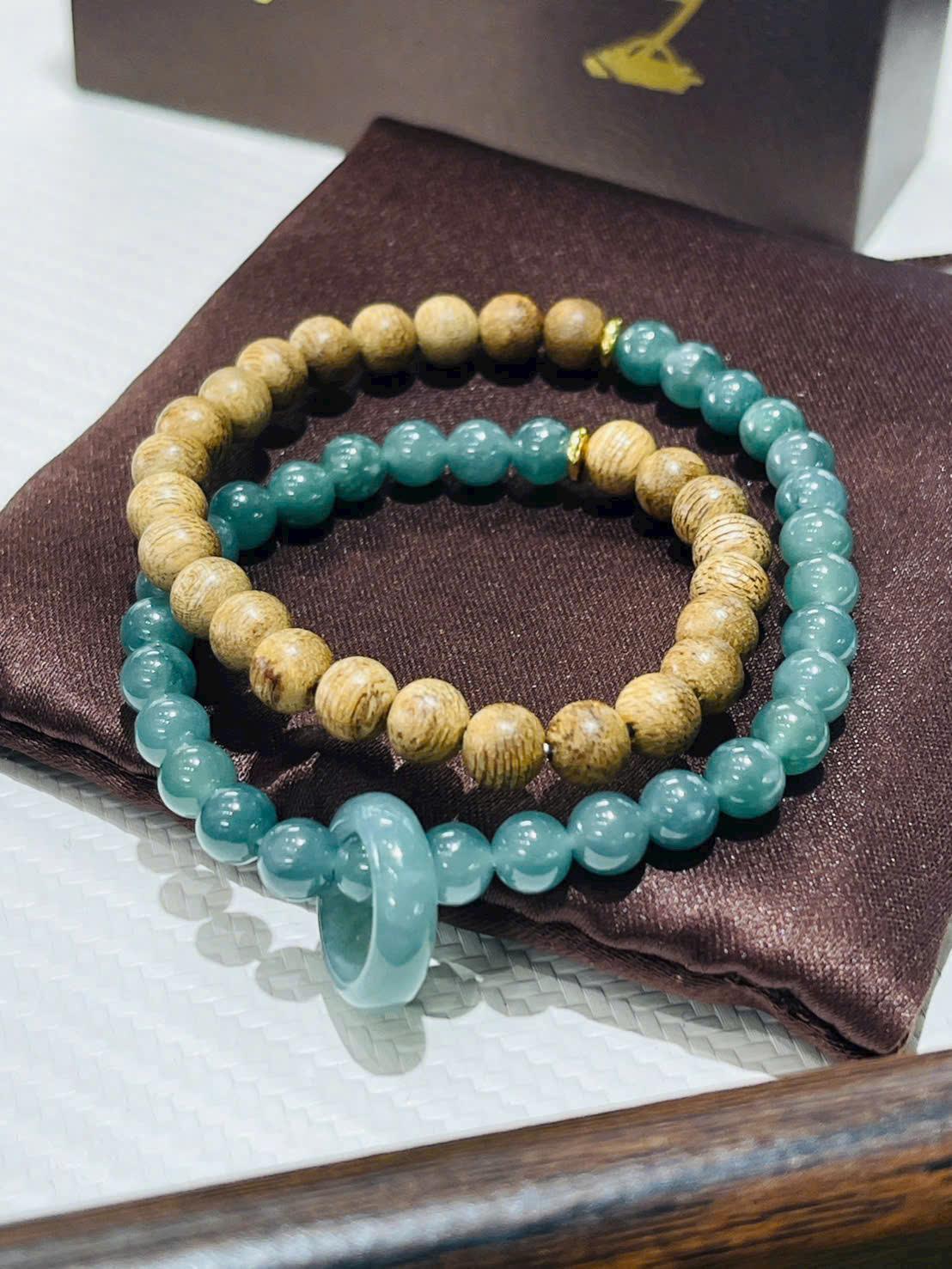 Ấn tượng đầu tiên khi nhìn vào chiếc vòng là sự hài hòa giữa sắc nâu trầm ấm của trầm hương và màu xanh trong mát của lam băng. Hai tone màu tưởng chừng đối lập nhưng lại bổ trợ hoàn hảo cho nhau, tạo nên một tổng thể vừa thanh lịch, vừa nổi bật một cách tinh tế.